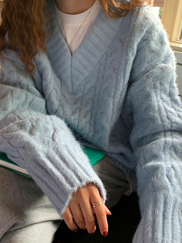 马上又是秋雨绵绵,一场秋雨一场寒,毛衣自然成为越来越实穿的单品。简约的麻花针织文艺复古,V领的设计修饰脸型展现迷人的锁骨,优雅迷人,下摆做了开叉,
