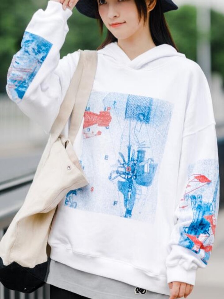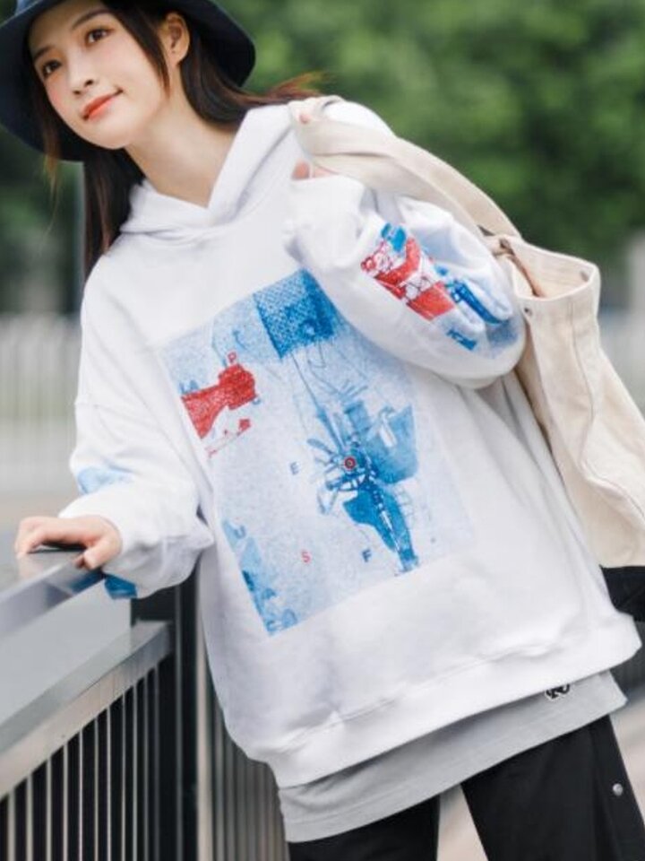白色的衣身,非常的干净利落,连帽的版型,非常的具有青春学院风。满身的俏皮印花青春范十足,很显大气。宽松的版型不挑身材,胖MM也能轻松驾驭。