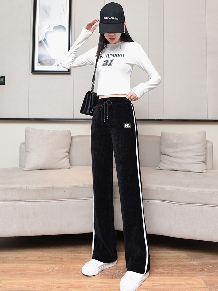 简约复古灯芯绒阔腿裤,面料为灯芯绒材质,非常厚实,手感很舒适,符合冬天的着装需求。宽松的阔腿裤型,遮掩腿上的赘肉,衬托出纤细笔直的腿型。