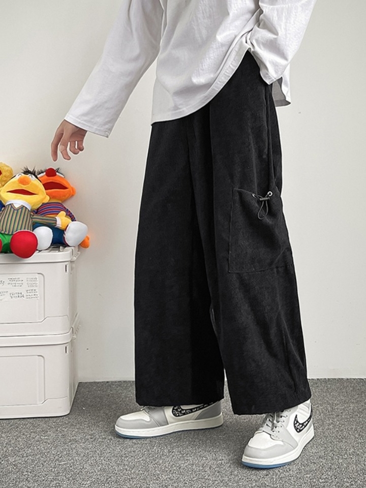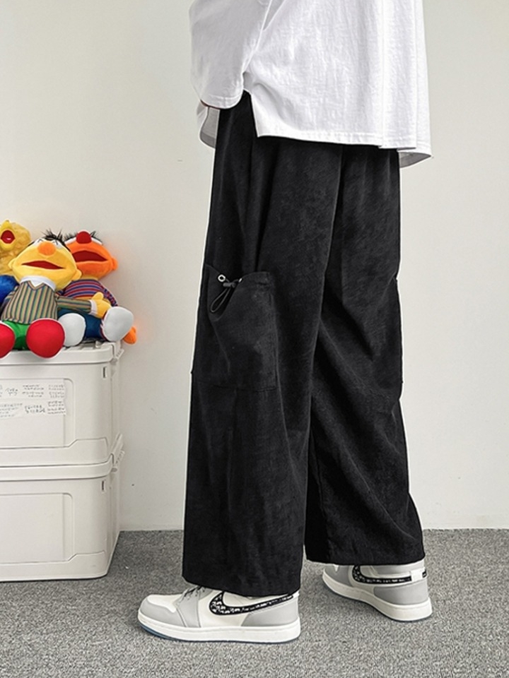 裤身整体版型较为宽松,上身效果非常舒适。裤腰抽绳设计,松紧程度随意调节,方便耐看。工装裤款式使整体型格更具层次。