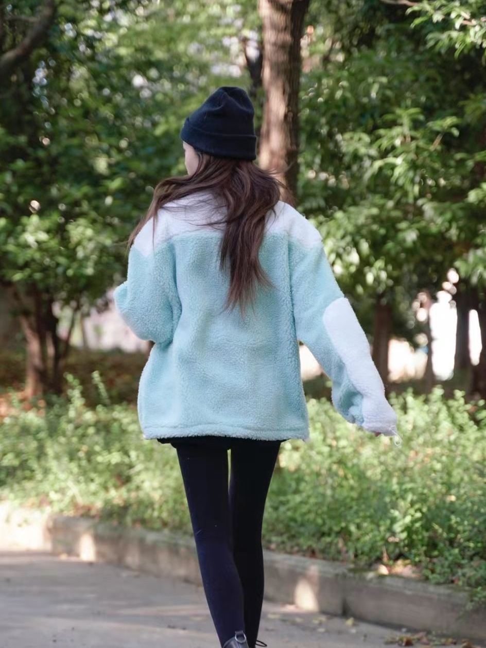这款拼色夹克的外套,是羊羔绒的料子。拼接设计看上去更有特色,增添时尚气息,格外清新,穿出时髦的街头范儿。