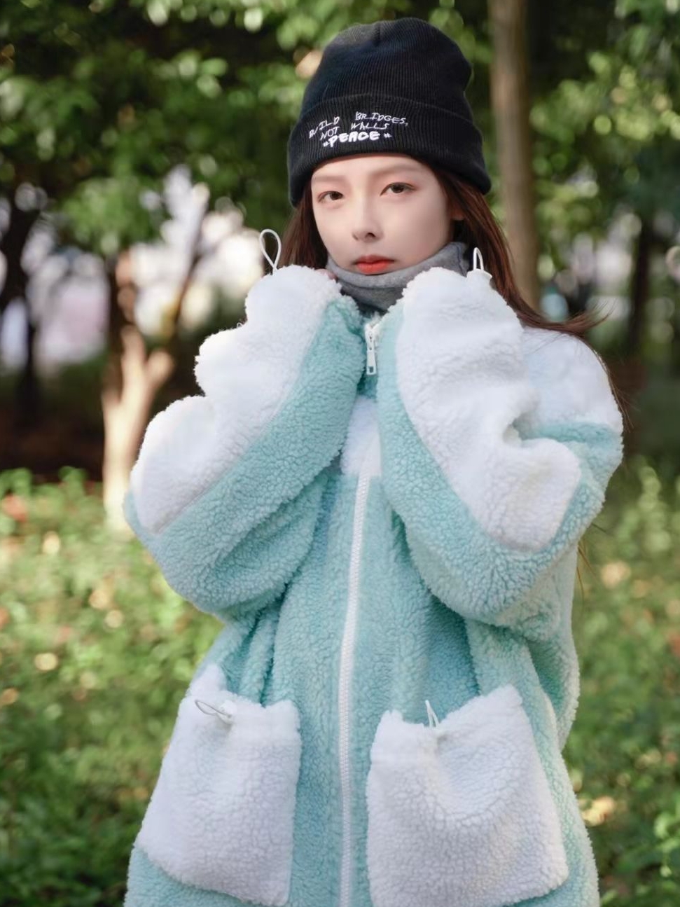 采用羊羔绒立领设计,触感柔软舒适,防风保暖。拼色防风收紧袖口,贴合腕部线条,锁住温暖。拼色全包边口袋设计,营造整体立体感。