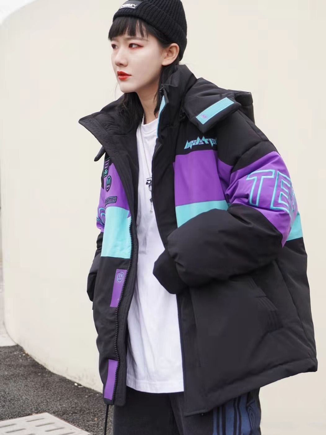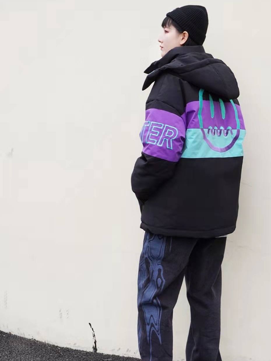 此款羽绒服采用撞色、拼接、刺绣、趣味卡通图案装饰,有减龄迸发青春活力之妙处;让人整体都充满动感和活力。