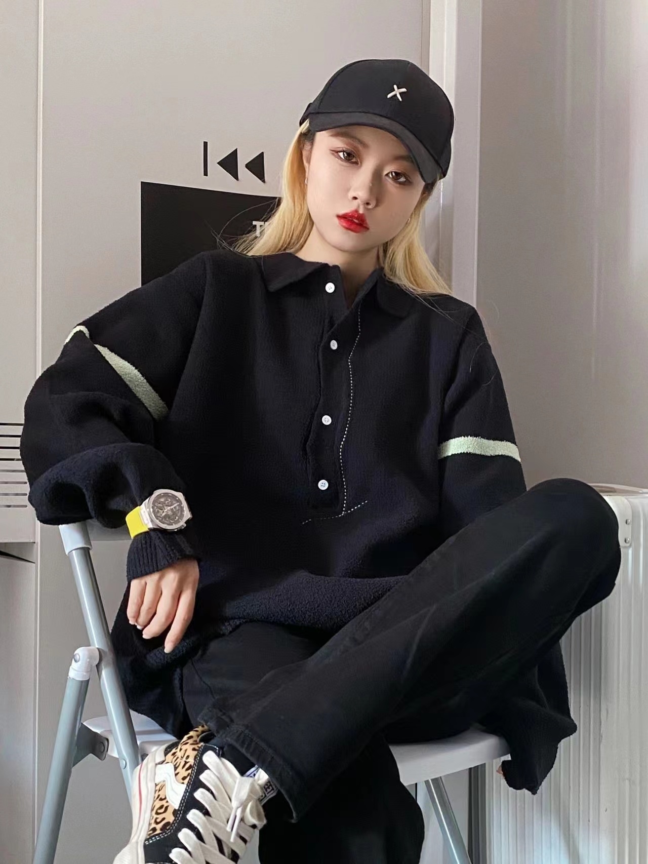 撞色的翻领设计,很好的修饰了脸型,撞色的翻领,更显时尚感,撞色的翻领,更显时尚感,撞色的纽扣装饰,增添了几分时尚感,修身的版型,上身显瘦显高。