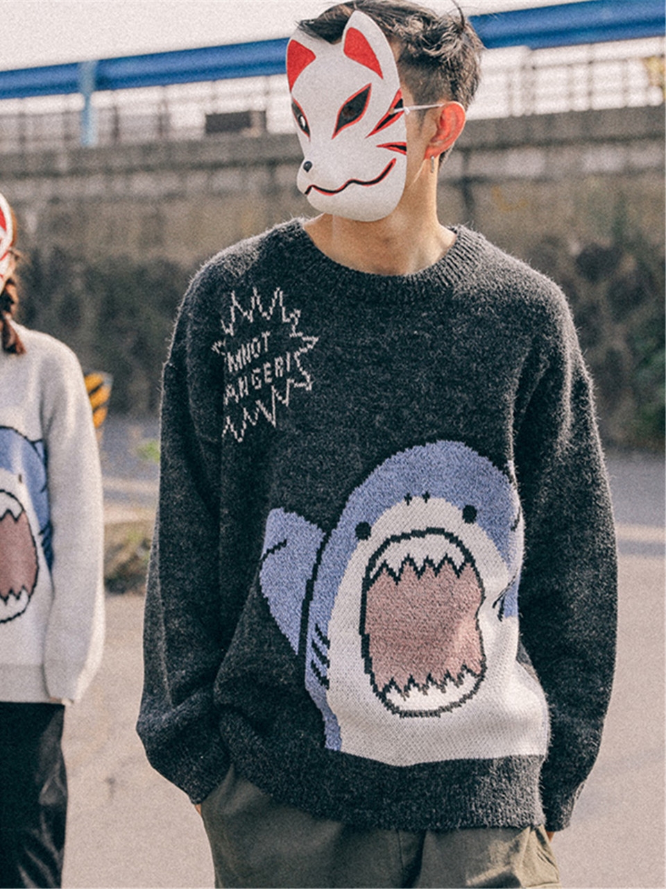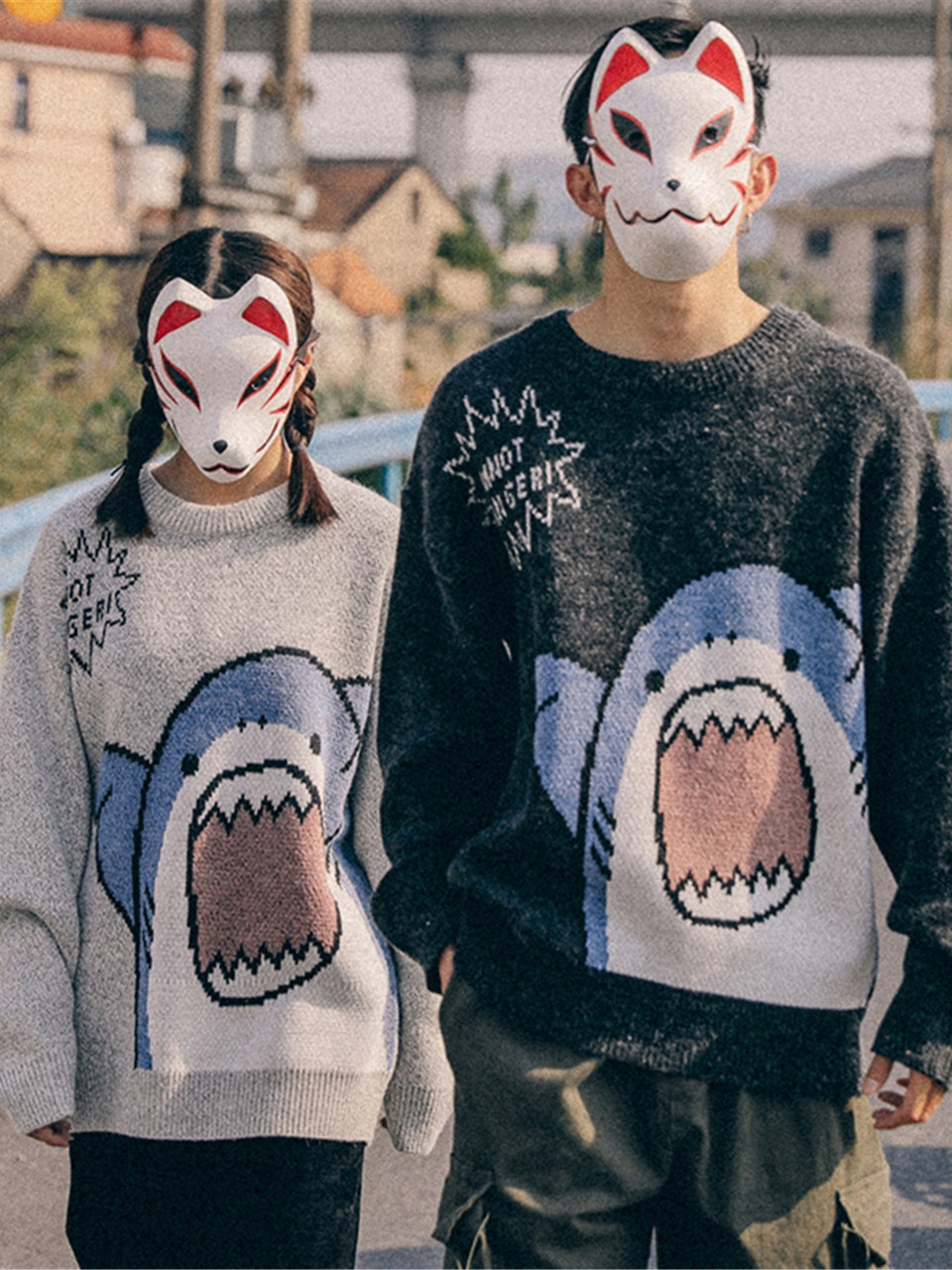 简单的纯色打底在衣身上加以了萌萌的卡通大鲨鱼提花,点缀增添整体的造型感突显日系休闲的街头潮流格调,个性潮范感满满宽松的版型剪裁。