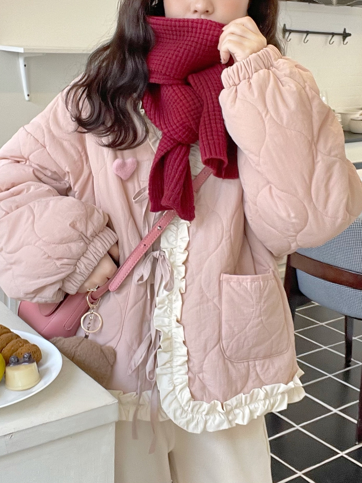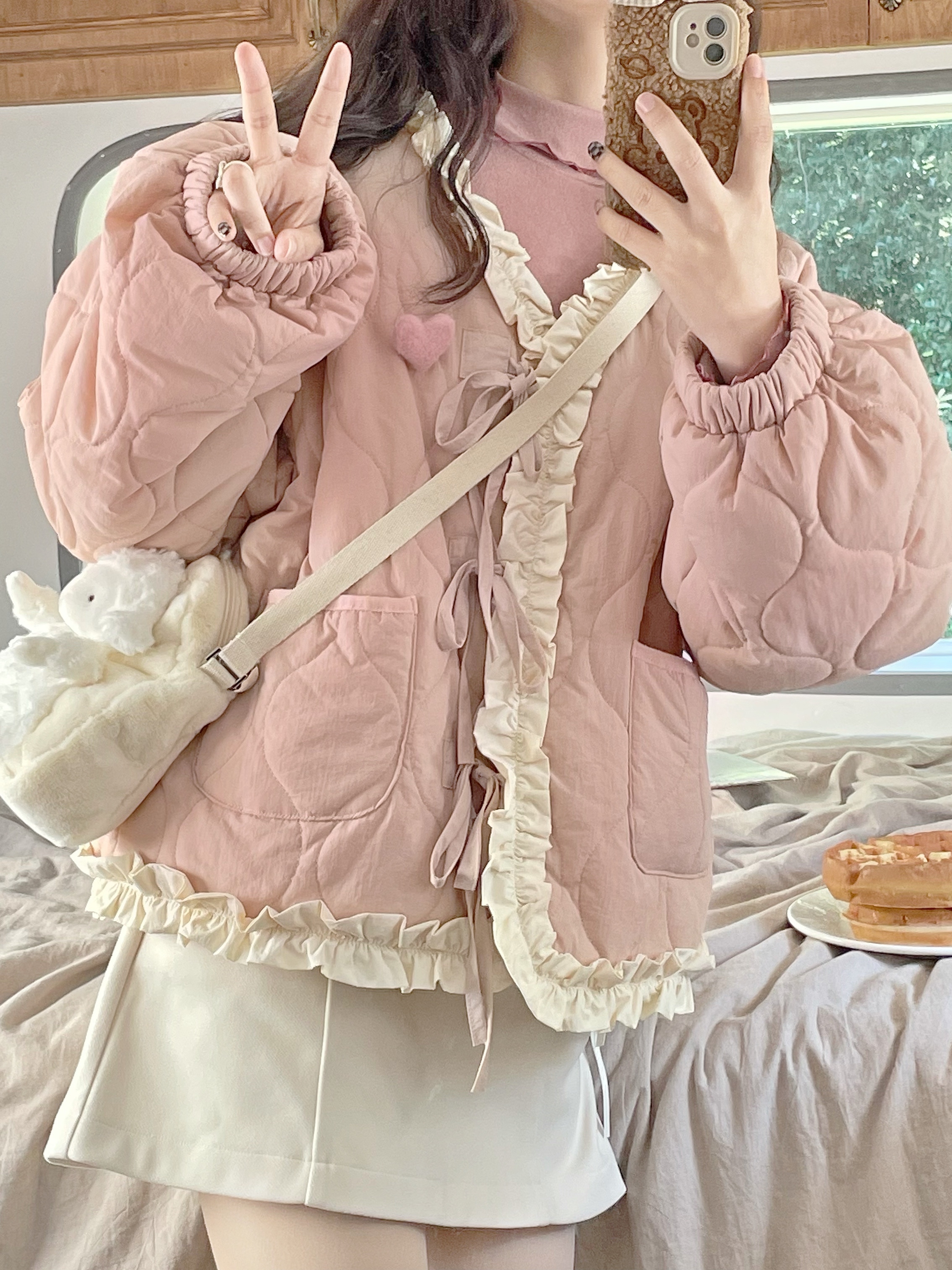 衣衣浅藕粉色设计俏皮可爱,版型宽松,时尚百搭,简洁小立领,为衣服增添亮点,腰部内侧收腰定型装饰,保暖实用,设计贴心,与众不同。