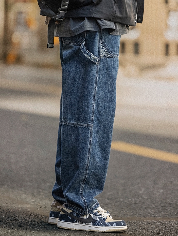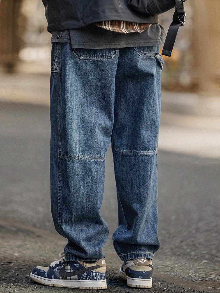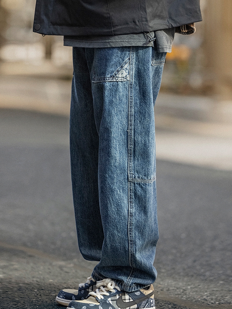 小腿部裤腿以缝线装饰,修饰小腿长度,加上深色色调给人一种个性潮流的感觉,又有一种粗犷的复古感。裤子本身为宽松型,不有会束缚和紧绷感。车线设计的几何线条,使裤身帅气十足。大口袋的设计装饰,增添休闲气息。
