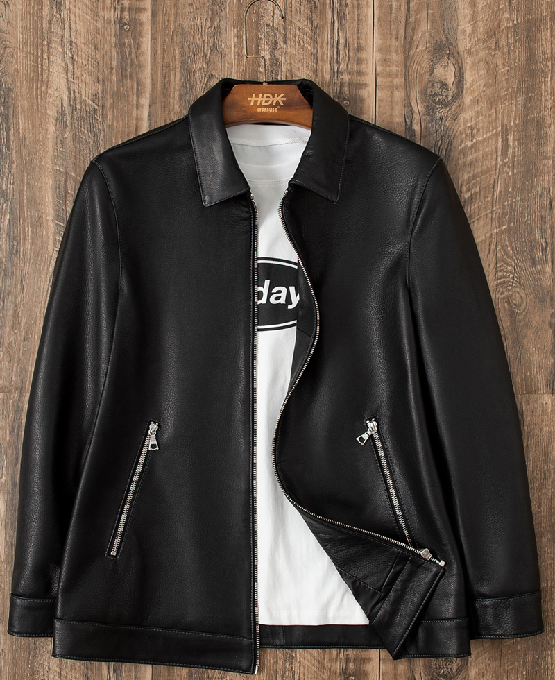 采用优质的头层牛皮制作而成,手感柔软,穿着舒适,修身的版型设计,上身效果很好,时尚的翻领设计,彰显男士的干练气质。