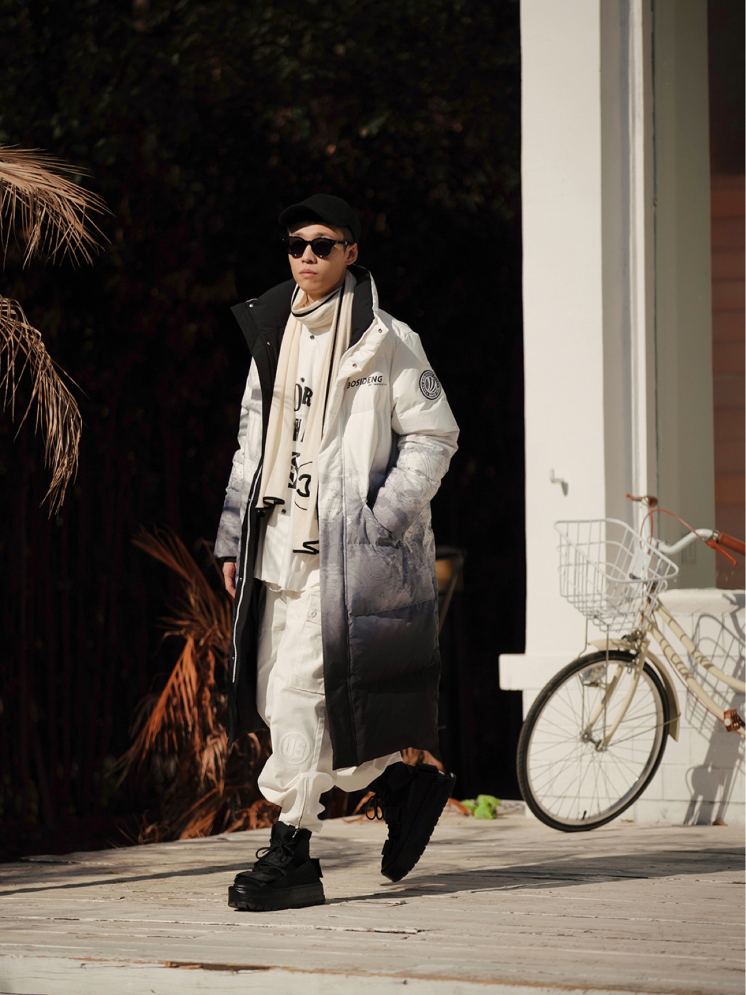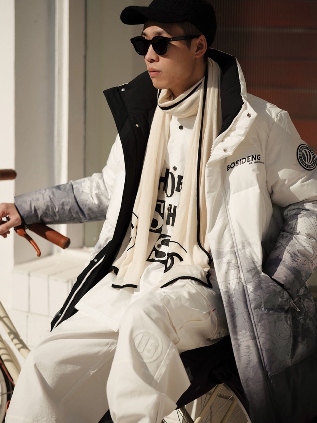 波司登羽绒服,用黑色点缀主系白色,多处字母、线条与渐变,共同勾勒出清晰的层次线条,让羽绒服造型打破沉闷,白色裤子是巧妙的选择。
