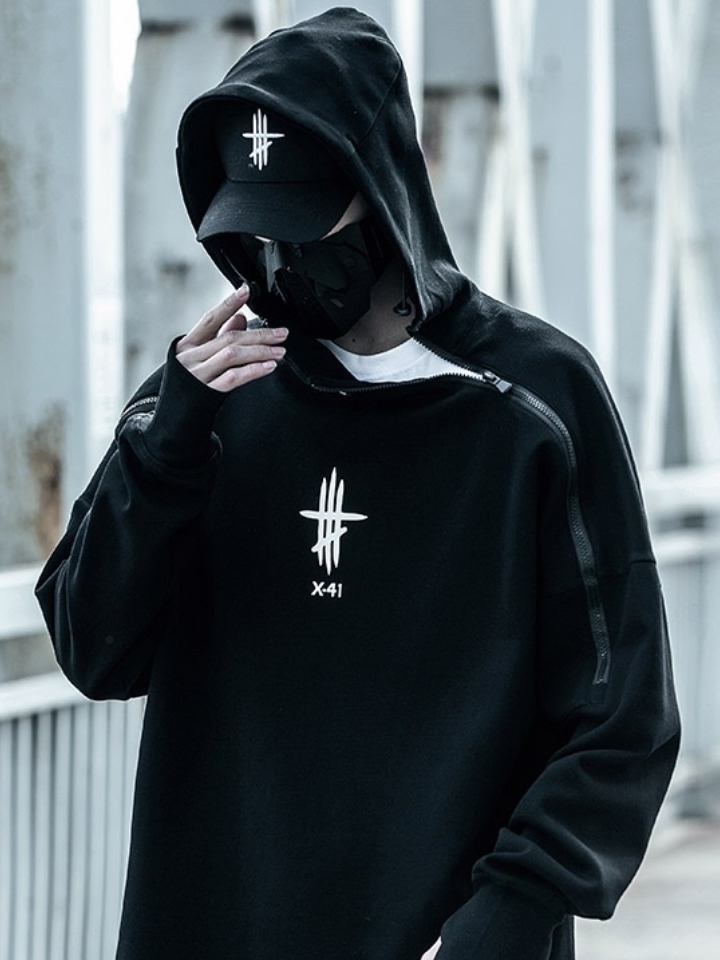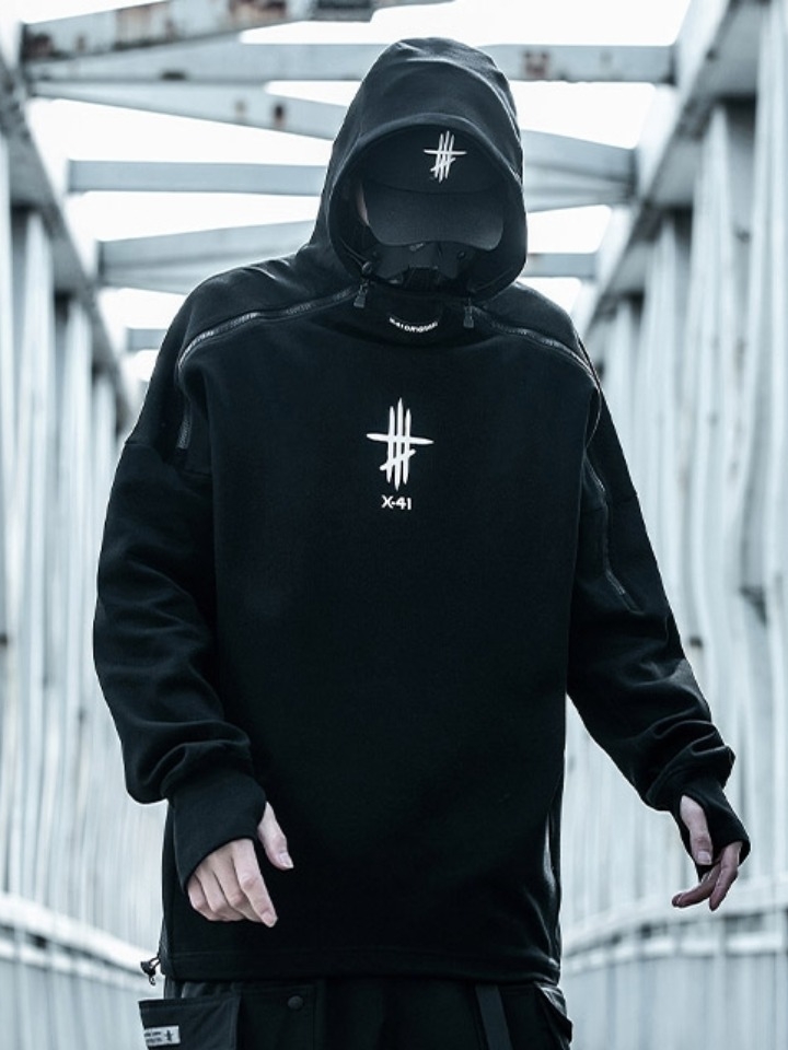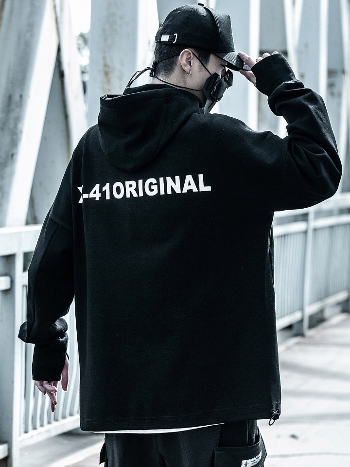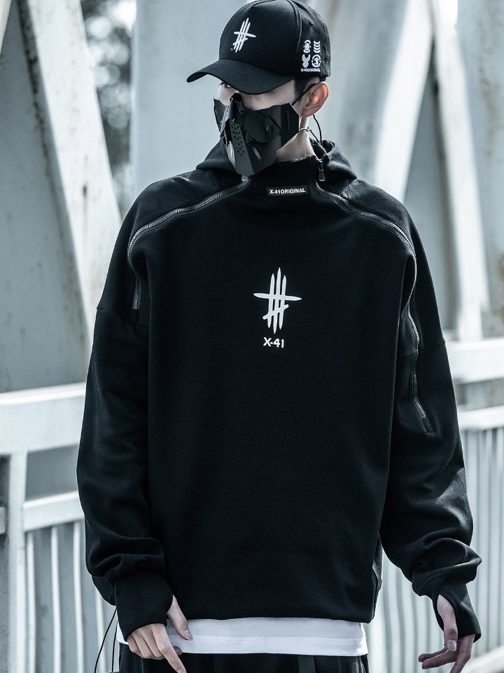 高领卫衣的色调很清爽,属于在造型中搭一件都能hold住造型的那种,所以在这套造型中的其他单品配色都使用了简练的黑色,两用的字母托特包、修身小脚裤和闪电板鞋,整个色调非常简约,给人一种利落酷帅潮男的既视感。