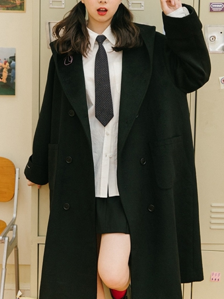 学院风的呢大衣,大大的连帽设计,增添俏皮感,趣味感印花点缀,打破纯色系的单调感,爱心造型的纽扣,很别致。