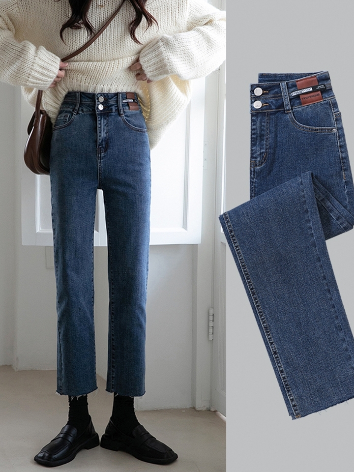 挺廓的水洗蓝牛仔面料,直筒的裤型廓感俱佳,高腰设计的九分裤长,露出脚踝显得格外高挑,脚口采用了做旧须边效果,随意不羁的休闲范。