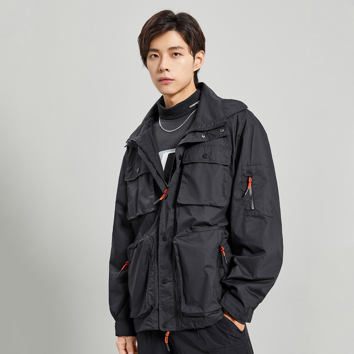 多口袋设计,实用又美观,夹克版型,穿着帅气有型,可拆卸,可随意变换造型,短款外套,拉长身材比例。