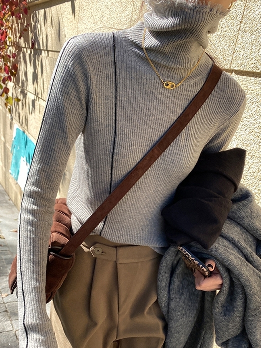 约百搭的针织衫,简约的款式,穿着时尚百搭,高领设计,凸显女性率真洒脱气质,撞色针织设计,演绎女性年轻活力气息,柔软细腻的面料,穿着舒适保暖