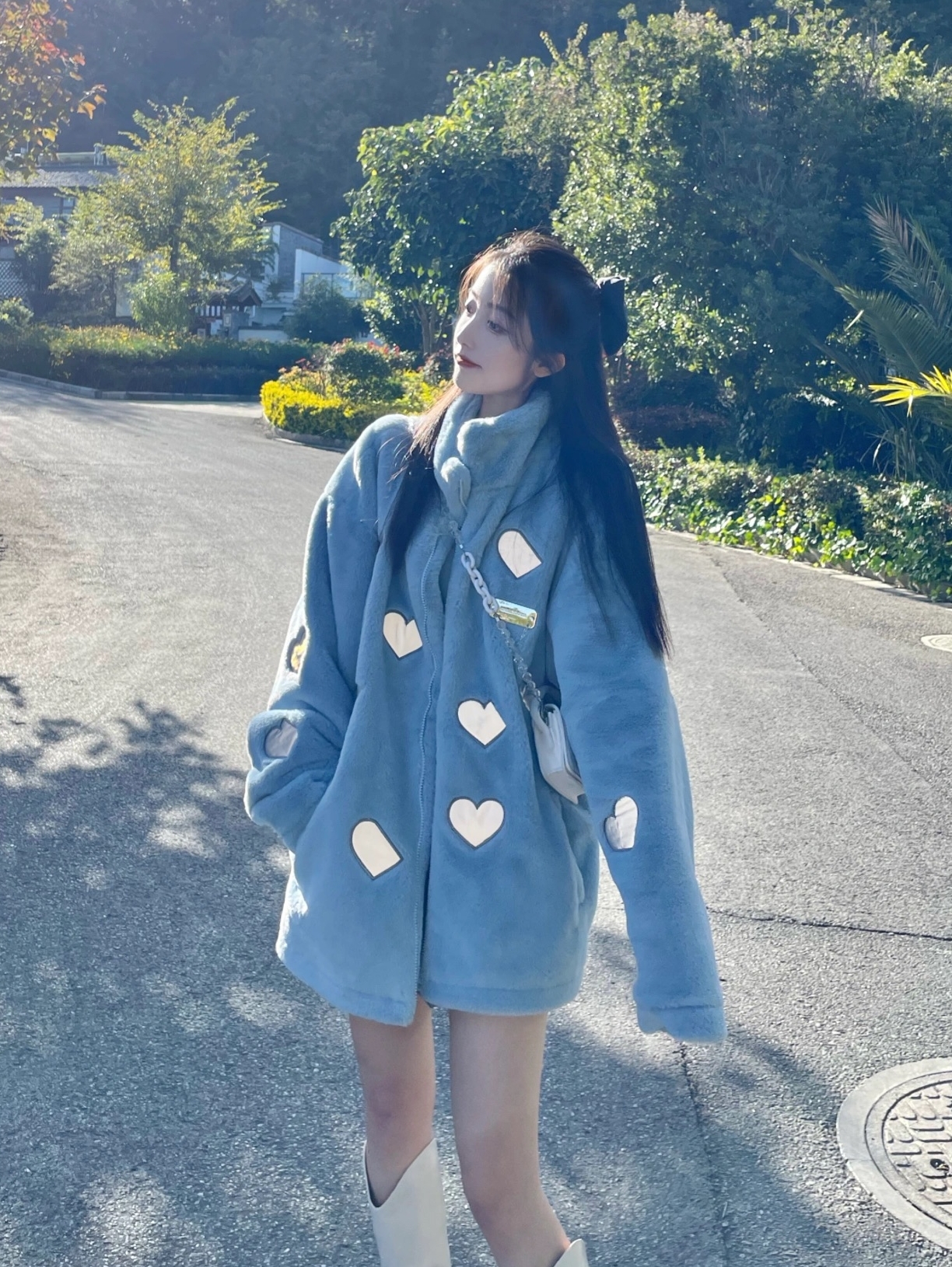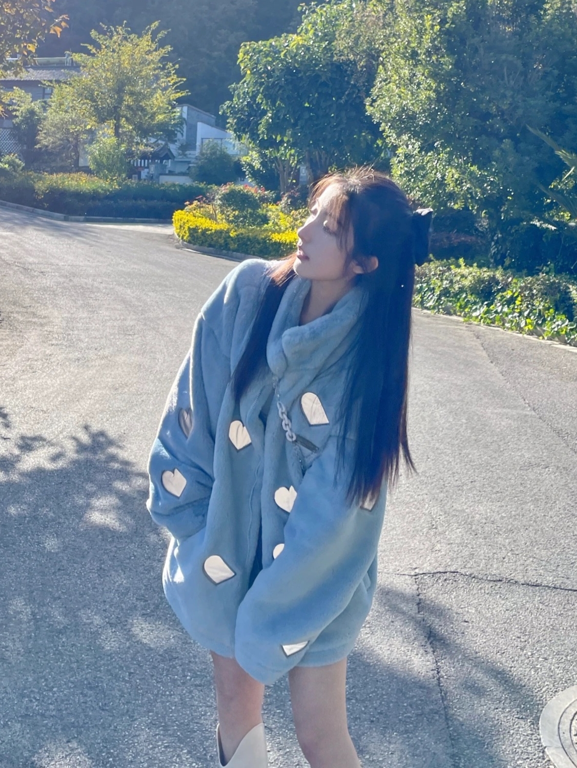反光爱心刺绣印花超级好看啊!面料还是我最喜欢的仿兔绒,超软超暖,毛茸茸+奶蓝色+爱心就很可爱~份量沉甸甸厚实的外套冬天必备
