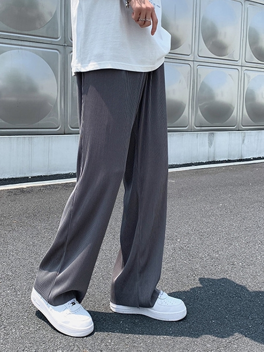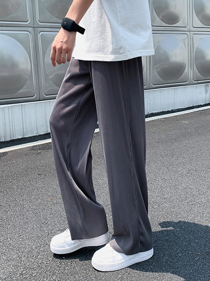 潮流高街范儿的一款男士冰丝阔腿裤,纯色的设计结合竖形条纹的肌理,丰富了整体的立体感,同时带来了显瘦的视觉效果。
