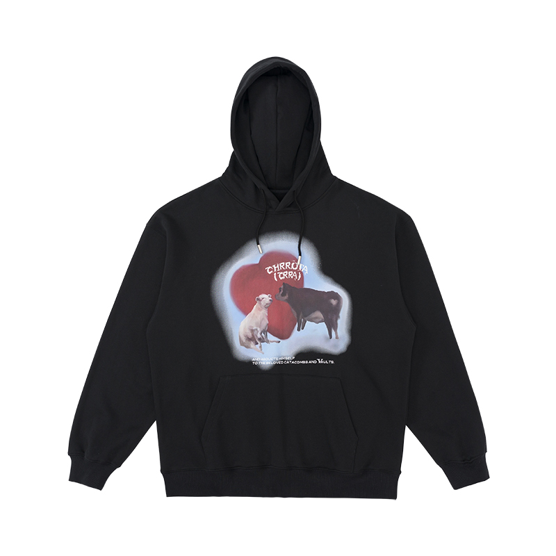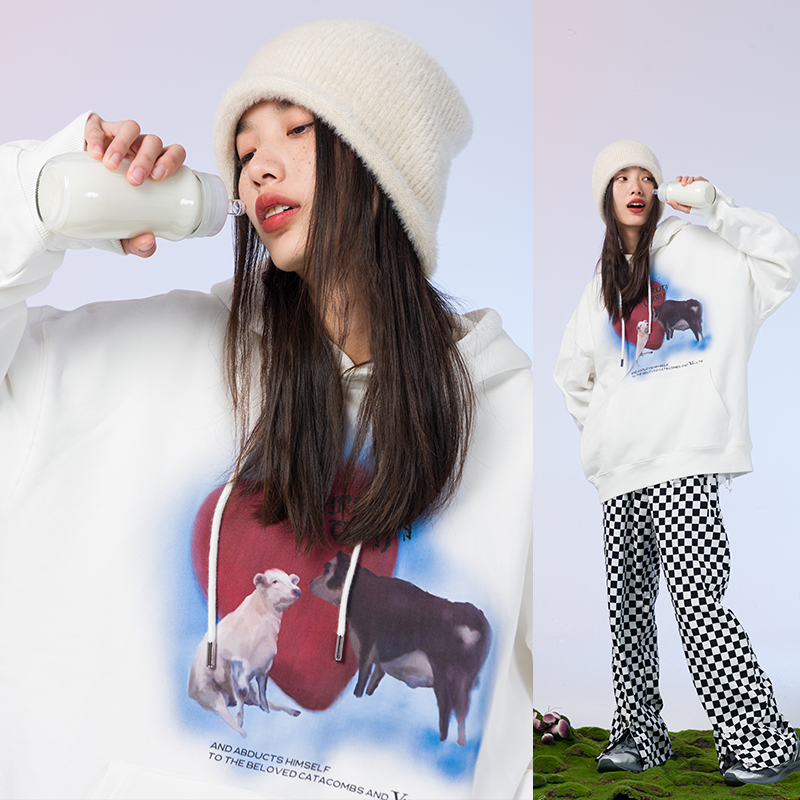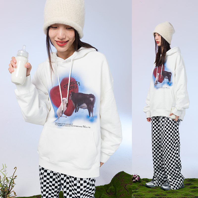 卡通印花图案,俏皮可爱。宽松卫衣,让你轻松驾驭。经典连帽设计,防风保暖。