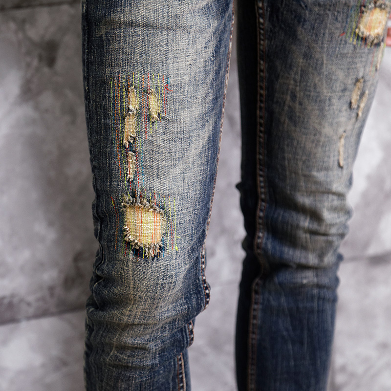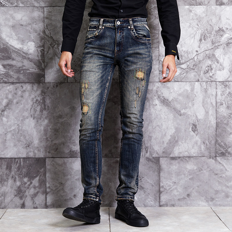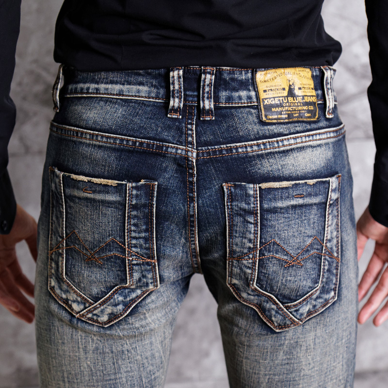 精致刺绣,彰显品牌魅力,修身版型,凸显身材曲线,牛仔裤,穿着舒适不紧绷,水洗做旧工艺,复古怀旧。