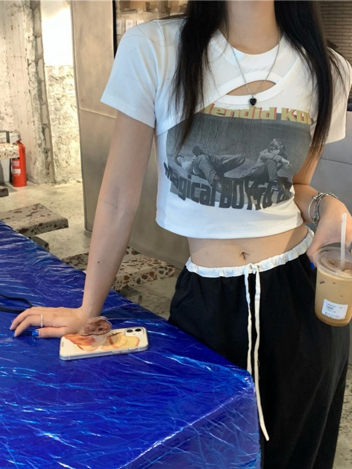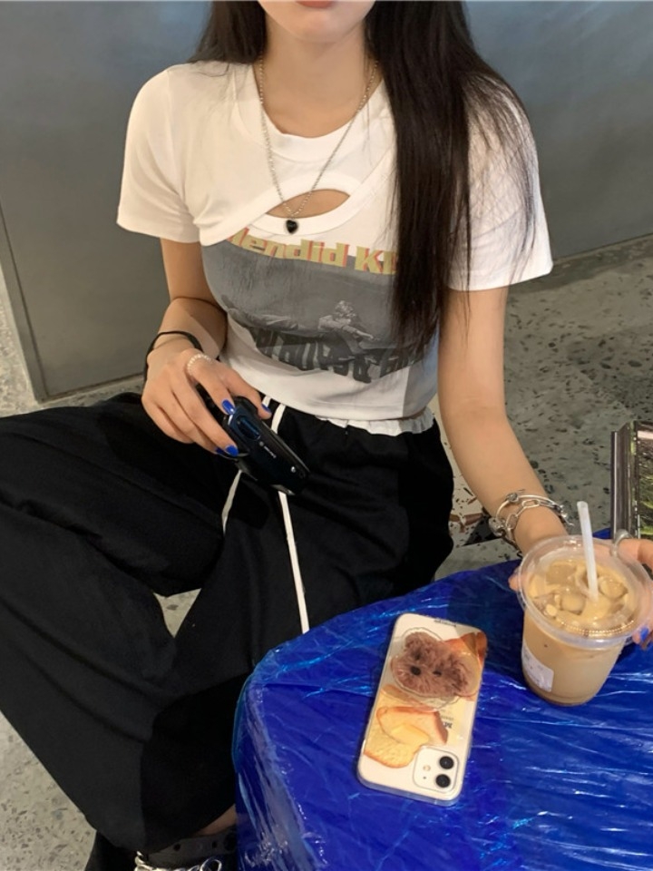比较简单的白色T恤,大大的领口,裸露出的锁骨显得很是性感,短款的版型,裸露出的肚脐带有点小女人的感觉,前面字母印花,简单又利落,修身的设计,搭配高腰的下装就好了!