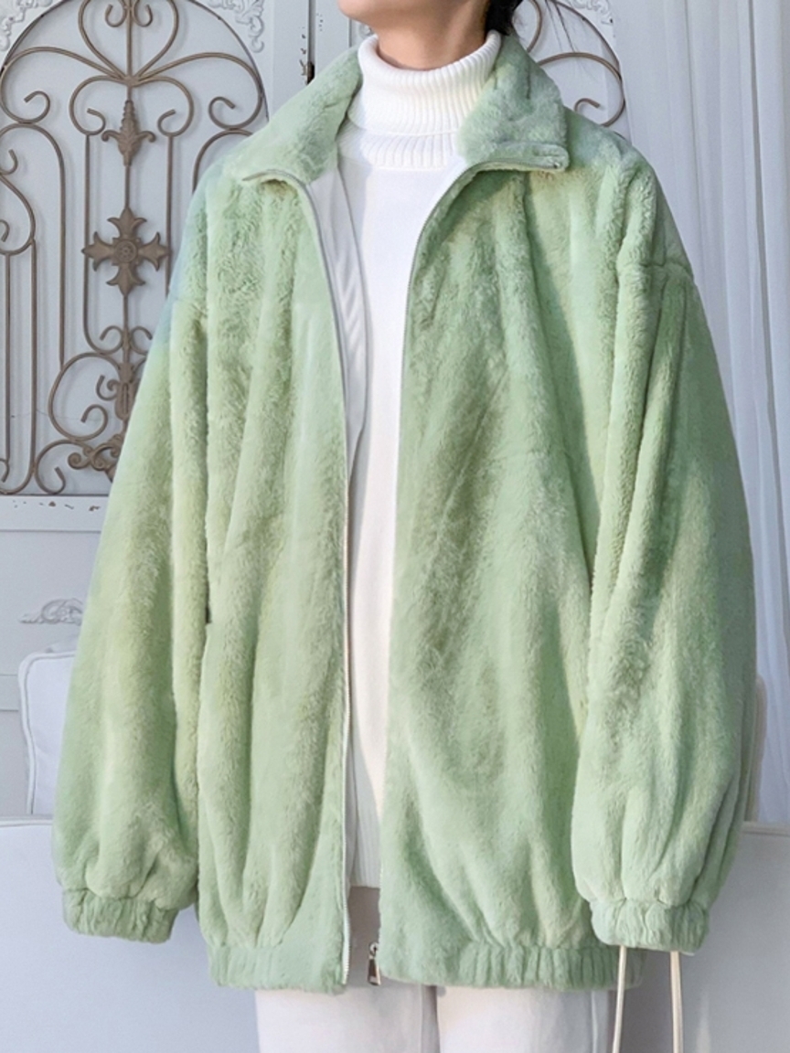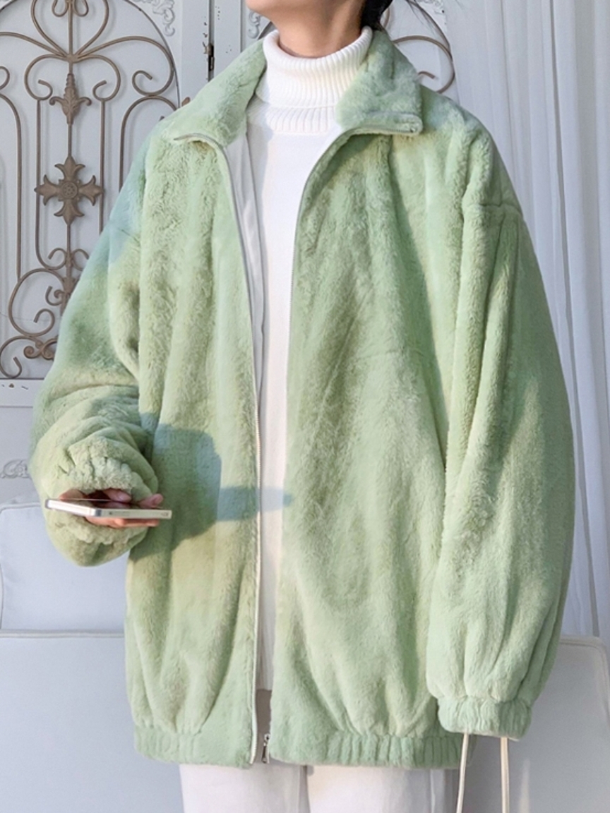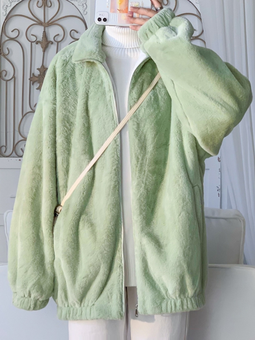 这是一款时尚潮流的纯色羊羔绒外套,时尚的小翻领设计,很好的修饰了脖颈线条,显得很是利落有型。