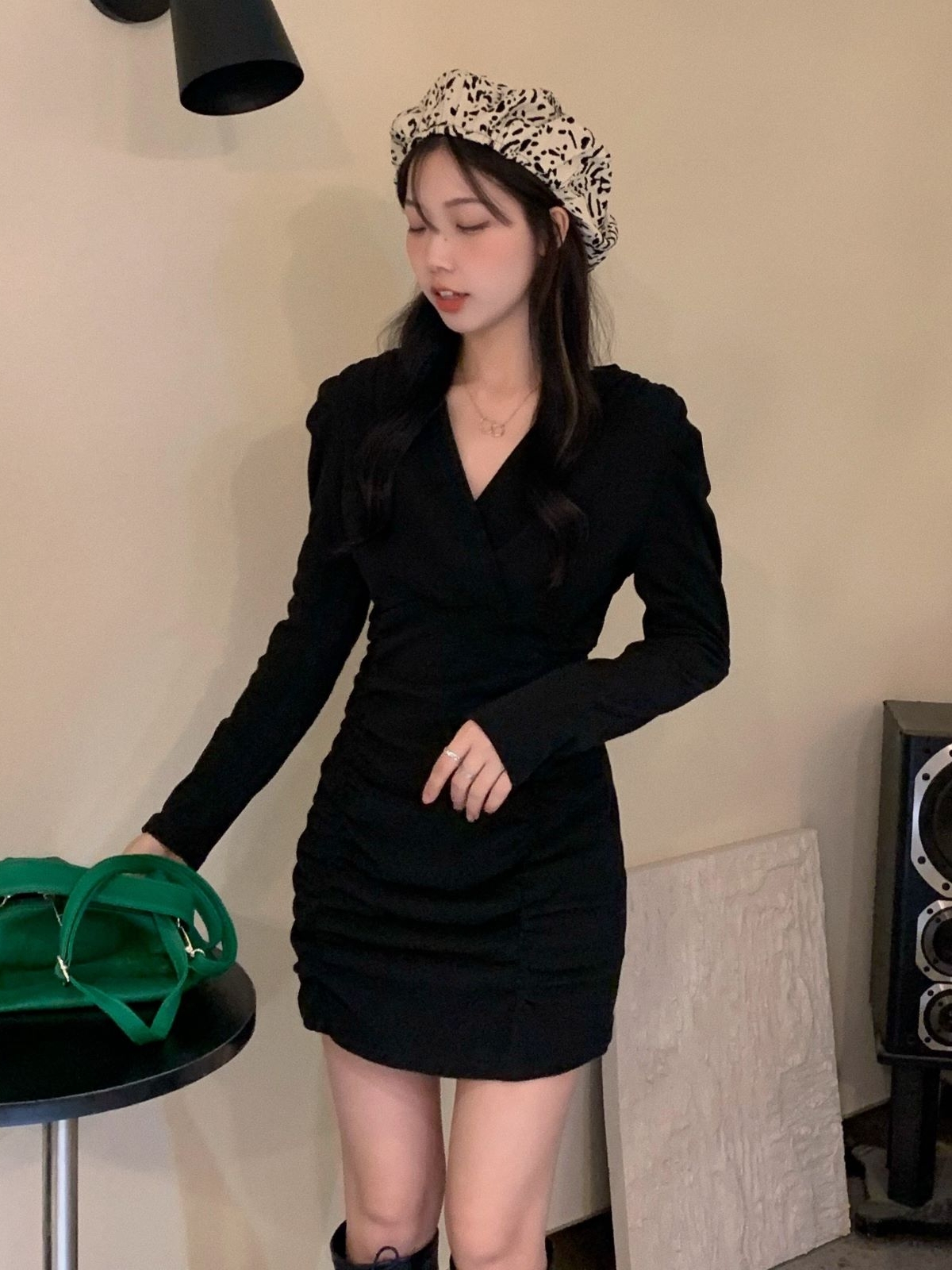 针织款的连衣裙设计,很有设计感的一条黑色连衣裙,裙子的面料有点衬衫的质感,看上去比较利落。V领设计的裙子,腰间有圆环系带设计,加上不规则的裙摆, 看上去很亮眼。