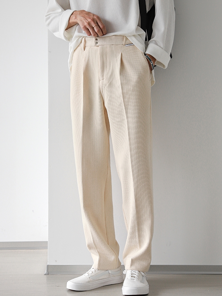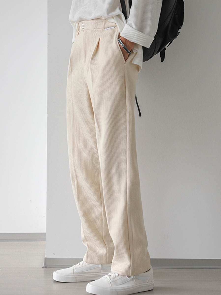 采用优质的灯芯绒面料,触摸起来柔软舒适,穿上身亲肤有温暖,自带着特有的细条纹理,很是简洁大气。直筒宽松的裤型剪裁,经典又简约大方,为整体造型增加吸睛点。高腰的设计不经意间就能凸显出曼妙的身姿,结合按扣的细节运用,勾勒出纤细的腰肢,同时突出高挑的身材。