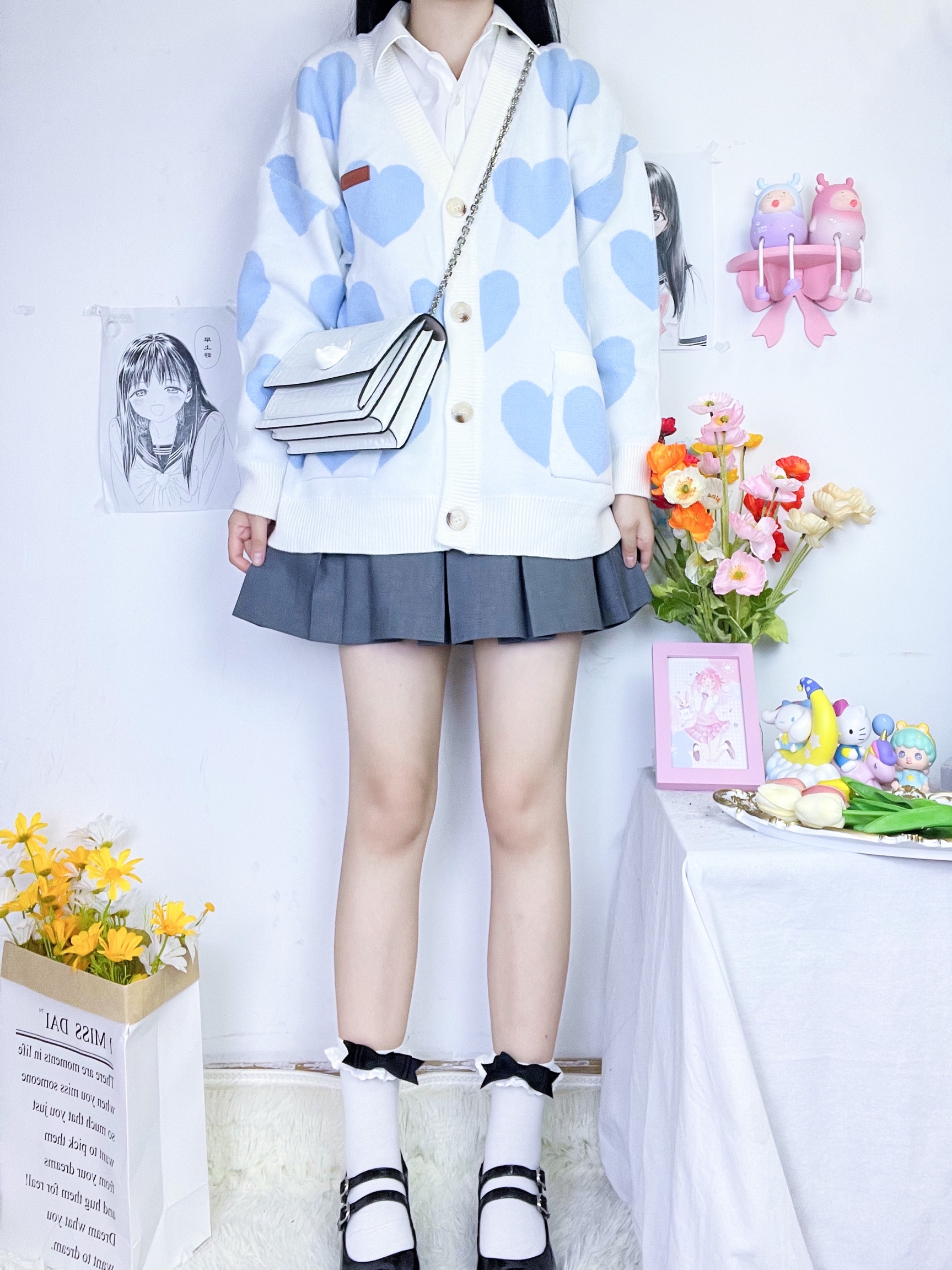 v形领口开衫毛衣修饰颈部线条,凸显出流畅的线条感。撞色爱心装饰点缀其上避免了单调的视觉感受,也显得整个人更加的清新甜美。两款颜色都很和谐,风格也是十分百搭耐看。