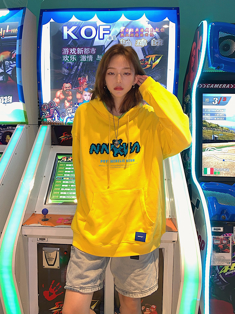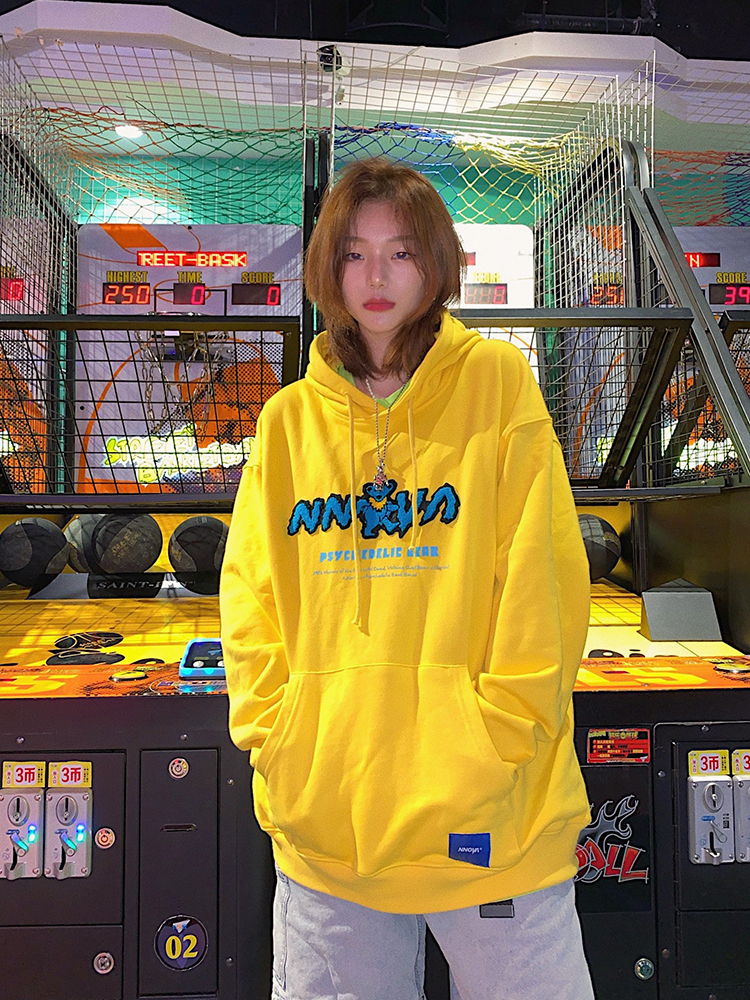 连帽设计,防风保暖性强。宽松卫衣,穿着舒适自在。卡通印花图案,俏皮可爱。