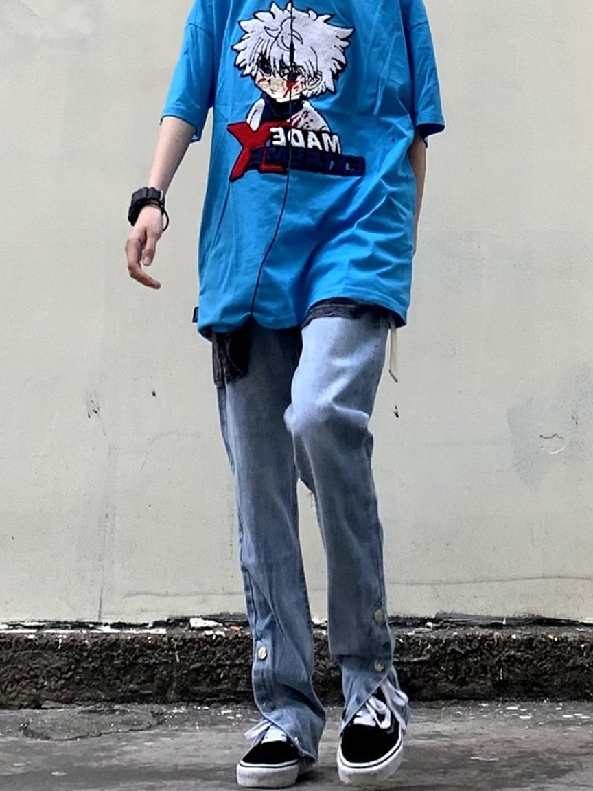 这款美式街头感满满的牛仔裤,上衣搭配一件宽松印花体恤,下装穿双休闲板鞋,就能出街凹造型啦。