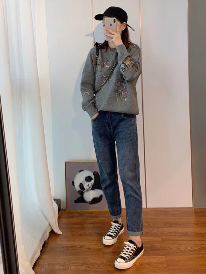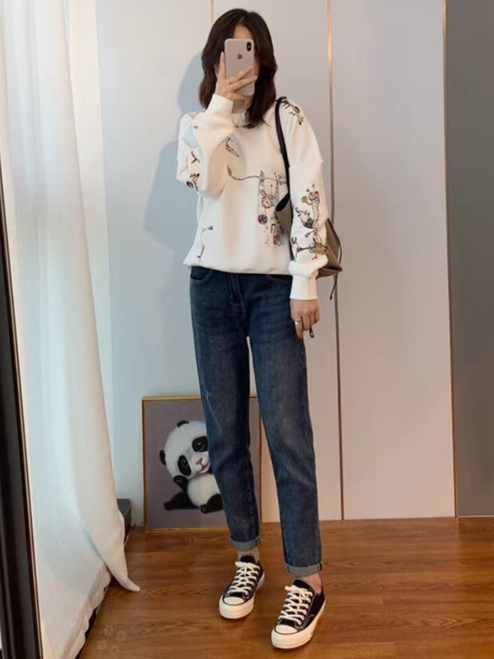 秋冬姑娘们的衣橱里换新一定少不了一条深色牛仔裤,深色和秋冬的视觉比较匹配,妖精口袋家的这款牛仔裤版型很好上身很显瘦,一条好的牛仔裤看中的是版型,裤脚处的黄色拼接元素很洋气,在秋冬搭配一双松糕鞋就可以完美出街了。