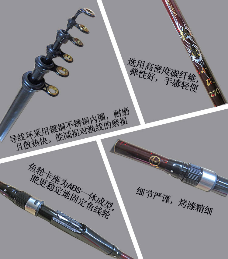 此款鱼竿采用进口碳素材质打造,结实耐用,手感舒适,耐磨耐刮。