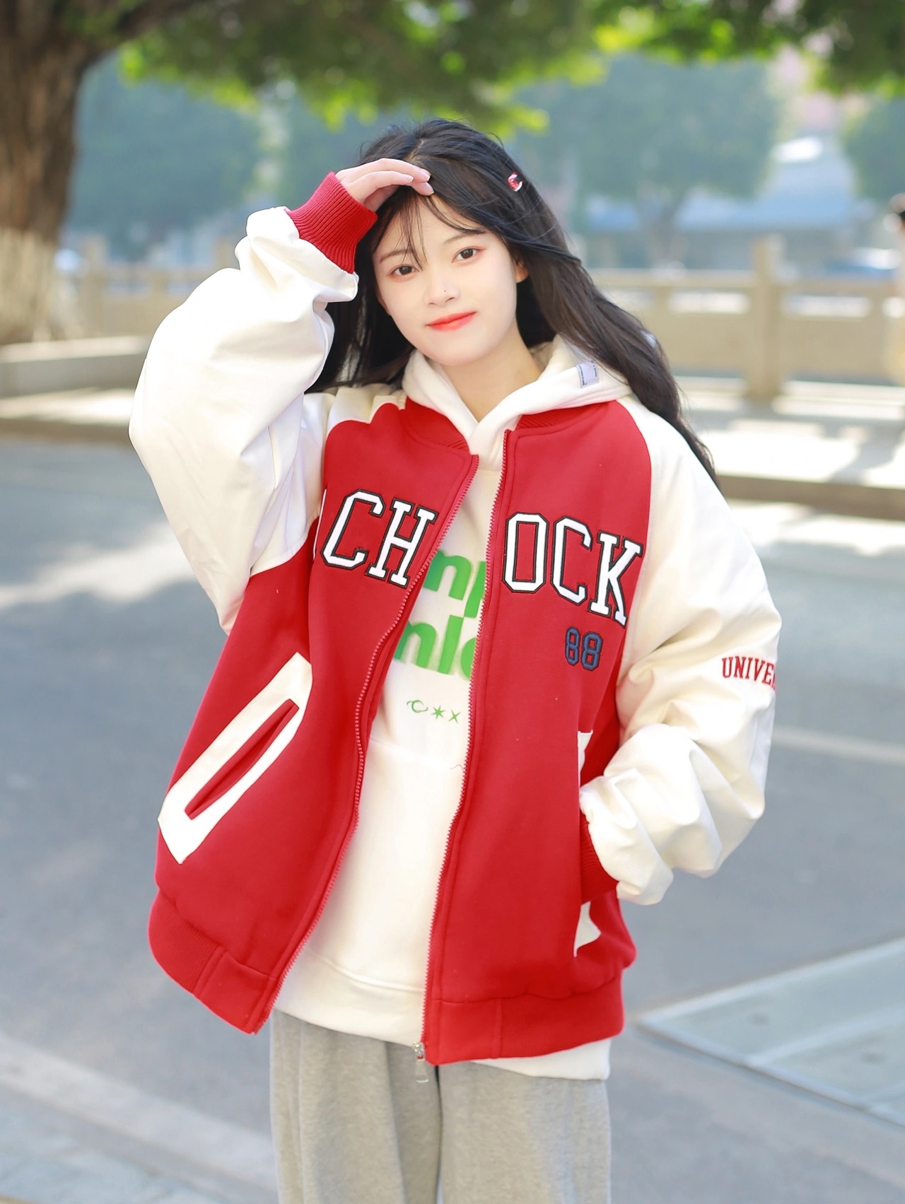 红色棒球服真的好好看呀!!个性化的拼色设计饱含无限的趣味性,棒球服设计极具休闲风的味道,简单款式充满低调质感,衣面上的印花点缀个性化十足,落肩袖设计彰显自由和洒脱的味道。