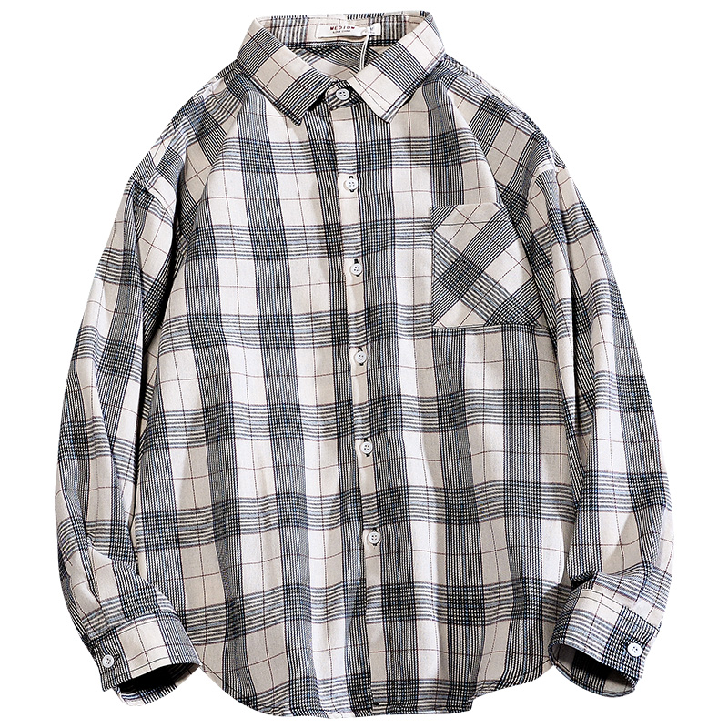 衬衫翻领,修饰颈部线条,衬衣版型,穿着挺括有型,经典格子元素,复古时尚,宽松版型,穿着舒适自在。