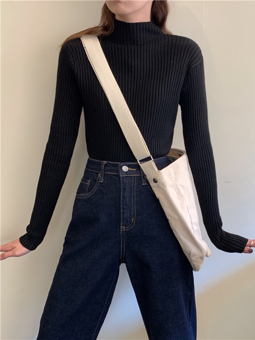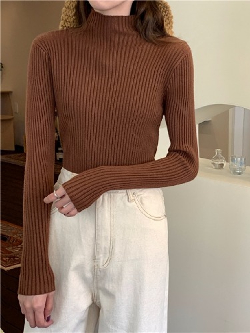 基础款的套头针织打底衫,半高领的设计是今年的大热元素,既能满足保暖的需要,也十分能修饰脖子,还能从视觉上带有瘦脸的效果哦。竖条纹的针织织法搭配修身的版型,显瘦又百搭,