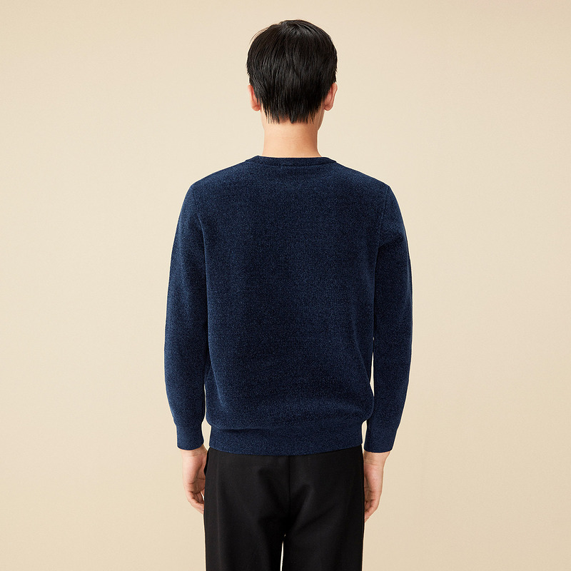 这款纯色针织衫,采用雪尼尔材质,手感柔软舒适,保暖性好,经典的圆领设计,修饰颈部线条,简约的纯色,时尚百搭,彰显男士的优雅气质。