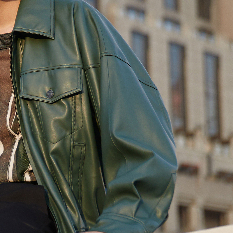 短款外套,拉长身材比例。夹克版型,穿着帅气有型。皮质材质,穿着舒适透气。