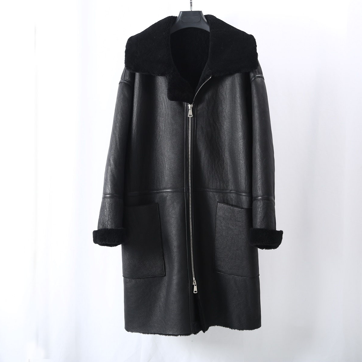 大翻领的设计,彰显男士的干练气质。皮毛一体的面料,保暖舒适,修身的版型,上身效果很好。