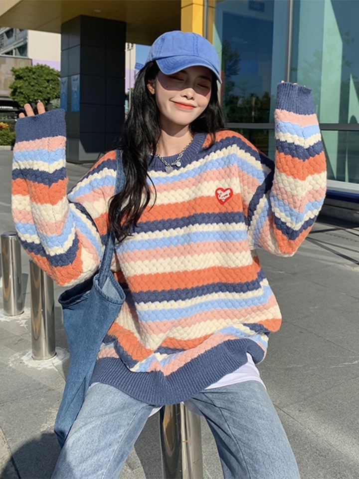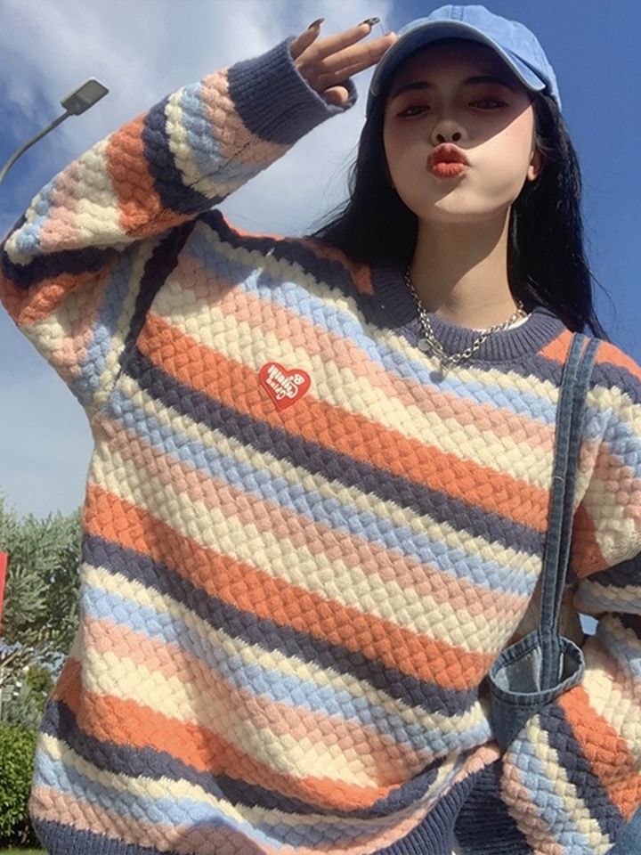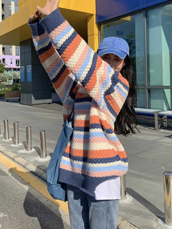 看到它的第一眼,就被它华丽丽的彩虹配色吸引住,整件毛衣用的是马海毛,质地柔软,看上去毛茸茸的,可爱炸了!毛衣做成宽松的短款,下面配一条修身牛仔既显腰身又拉长双腿。