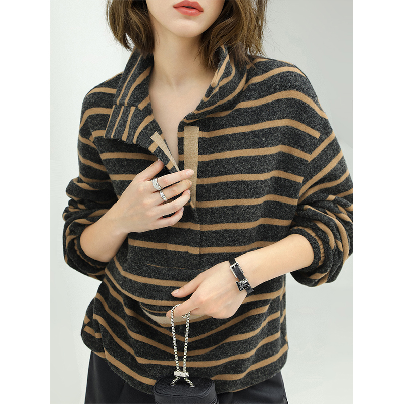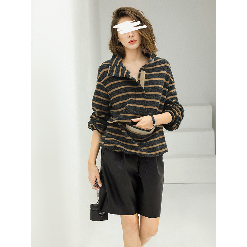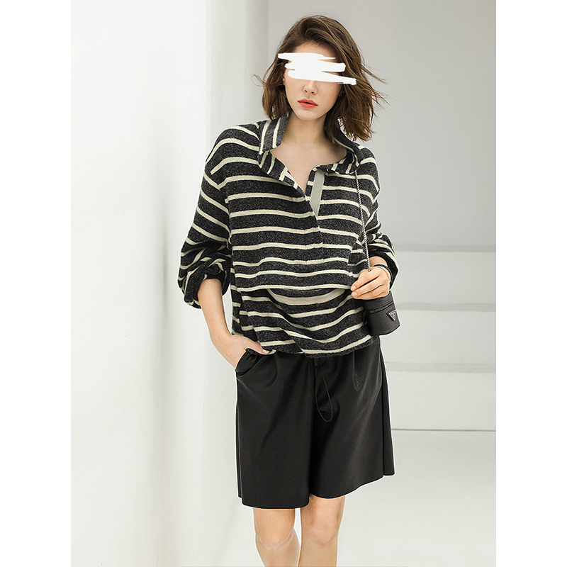 圆领的设计,修饰颈部线条,简约大方,宽松的版型,不挑身材,穿着舒适自在,休闲的条纹,活力不单调,优质的面料,亲肤透气,上身休闲时尚。