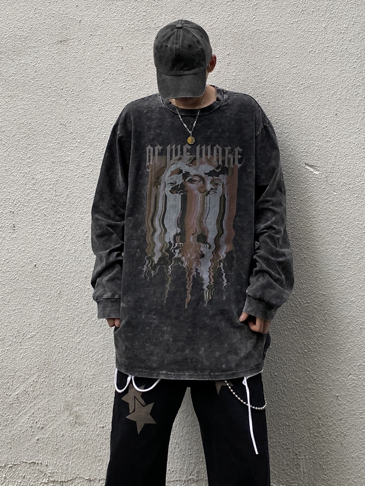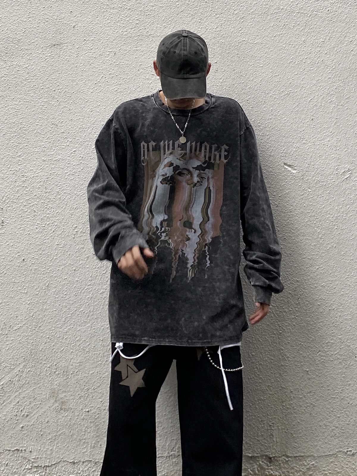 大码潮牌出品的这款卫衣,经水洗处理颜色质感极具怀旧格调,前幅艺术重影印花装饰点缀,亮点突出。