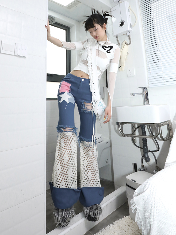 牛仔裤采用了破洞的设计,让裤子看起来更加的时尚,而且破洞设计的裤脚,更是增添了几分时尚感,搭配一件T恤,就能轻松穿出时尚的气质。