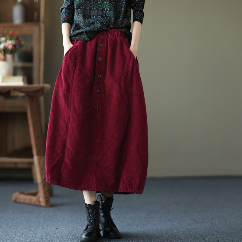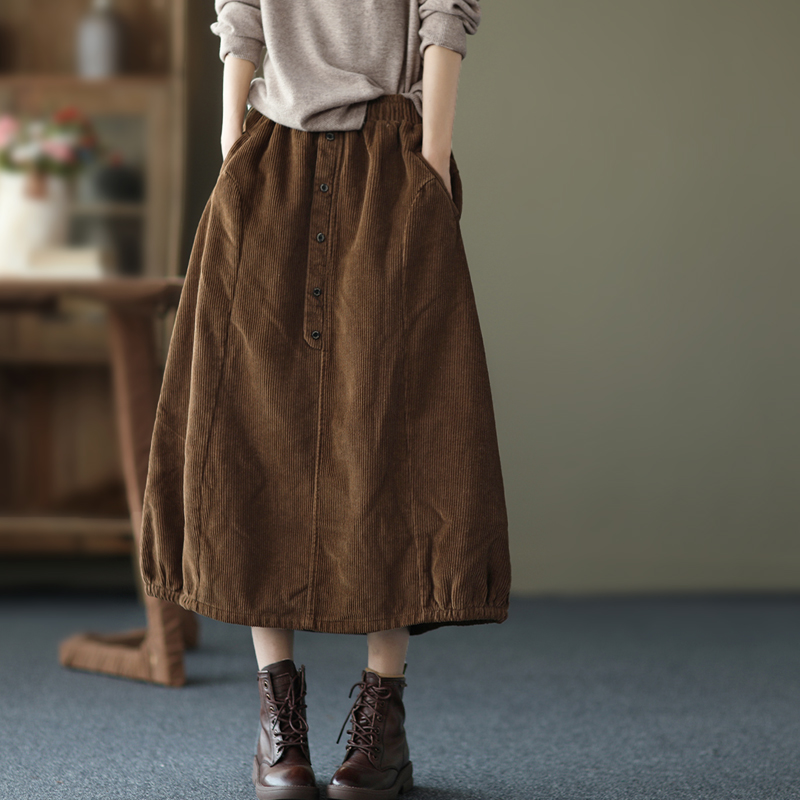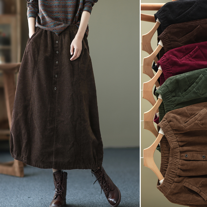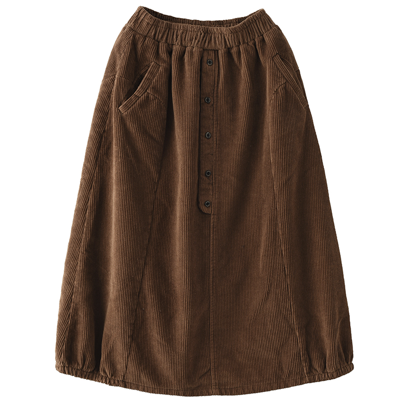 灯芯绒面料的半身裙,高腰的设计,拉长腿部线条,显瘦效果很好。
