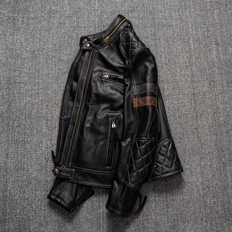夹克采用了优质的头层牛皮,手感柔软,穿着舒适,修身的版型设计,上身效果很好,搭配上一条牛仔裤,就能轻松驾驭。