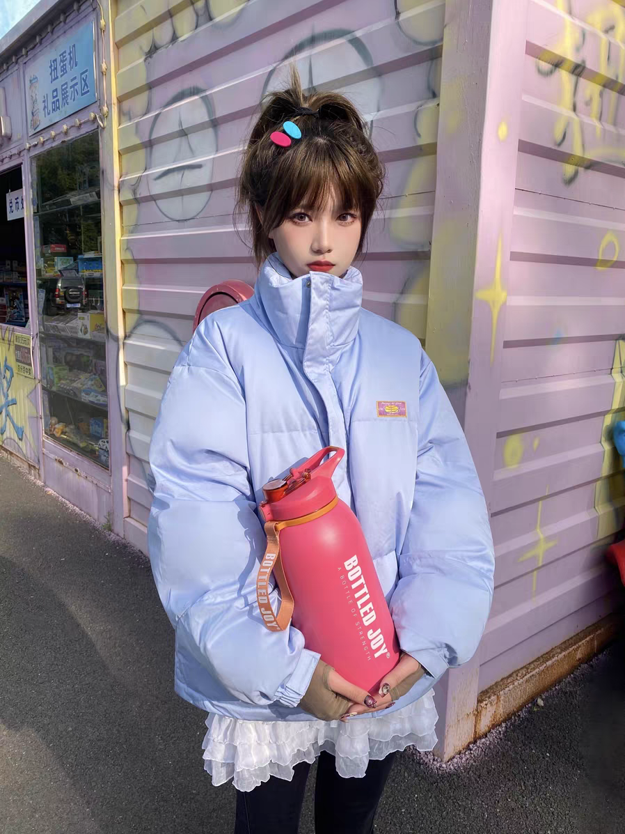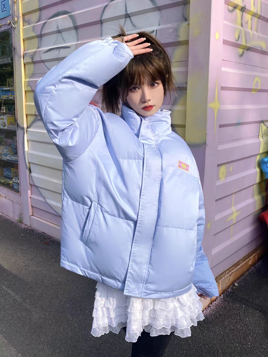 俏皮立领+拉链钉扣双层衣襟+面包衣型,不是菠萝包,是北海道牛乳吐司,拒绝充气膨胀感,我要我的小蓝显瘦又显幼,胸口复古撞色刺绣小标牌chic funk,是冷厂精神,时髦、潇洒、自由自在。