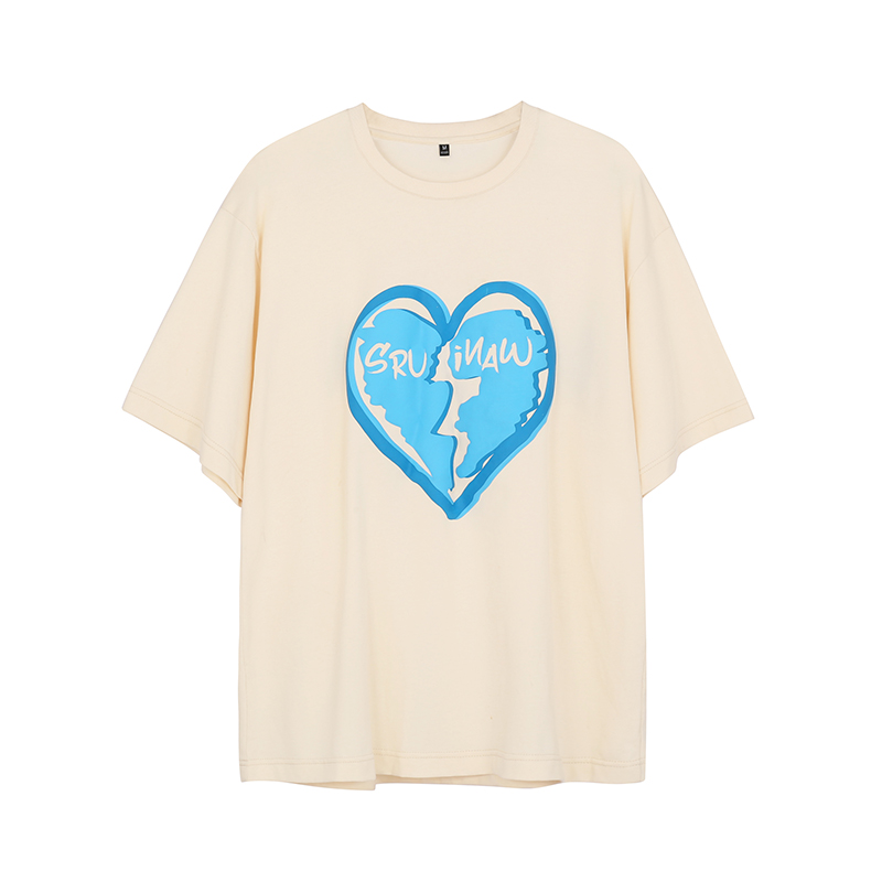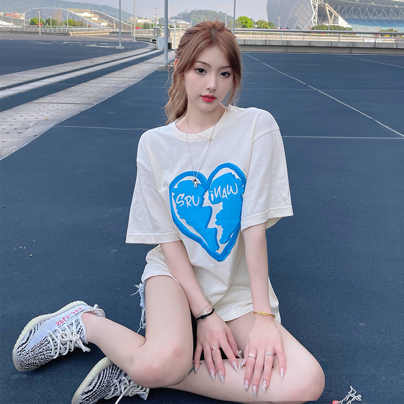 短袖设计,修饰手臂线条,宽松T恤,让你轻松驾驭,胸前爱心印花,俏皮可爱,宽松版型,穿着舒适自在。