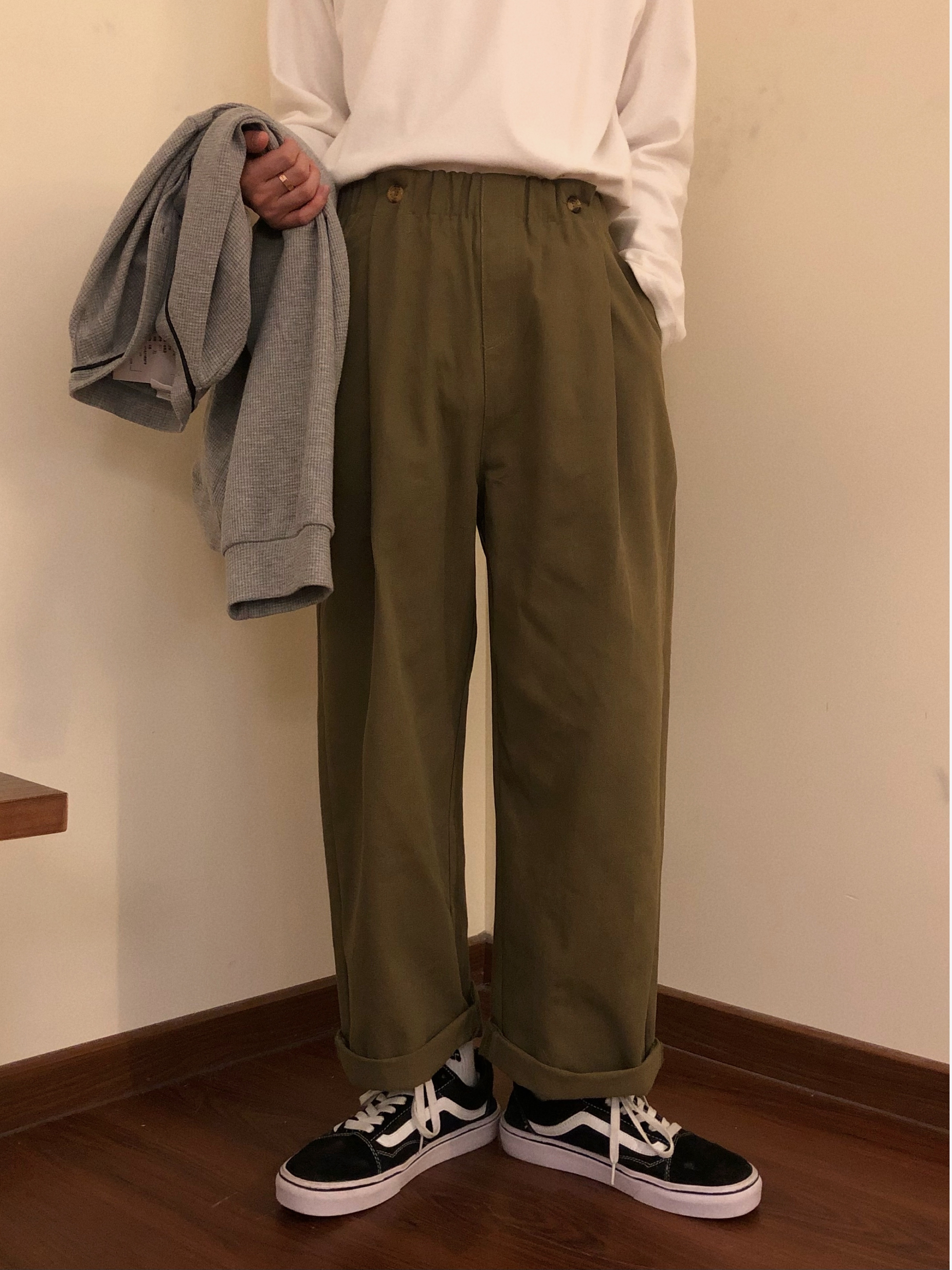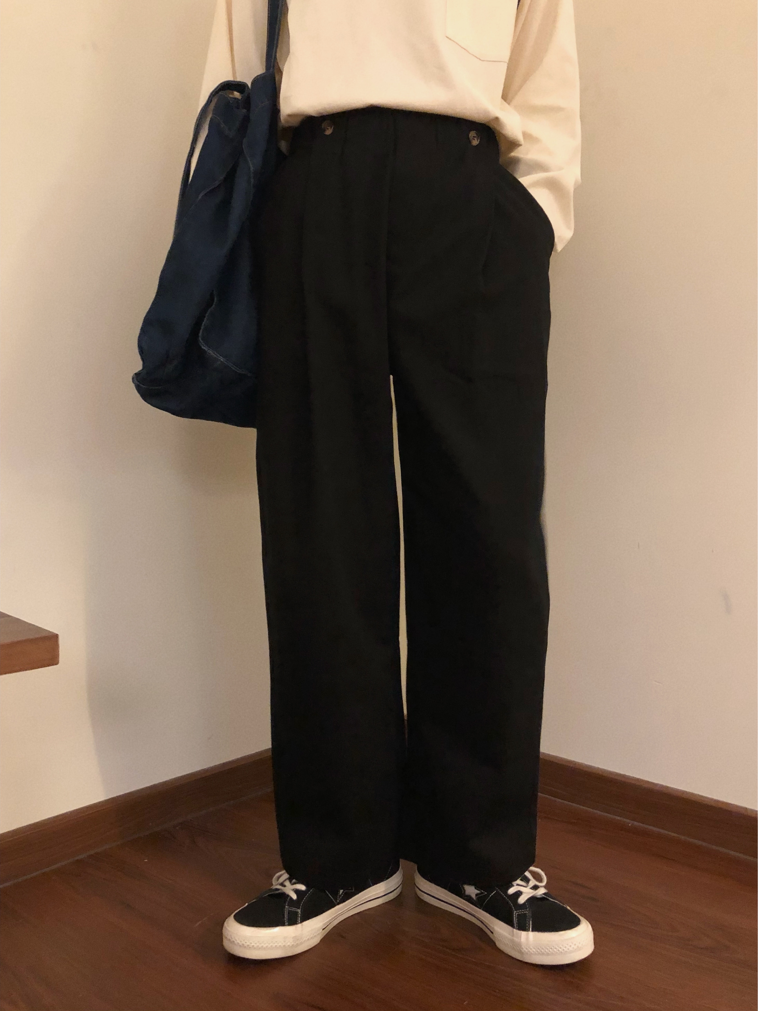 我觉得阔腿裤很大的一个月优点就是可以掩饰腿型,不管你是什么样的腿型穿上阔腿裤总是没有错的,而且它既流行又百搭,冬天拥有一条阔腿裤分分钟拥有各种搭配。