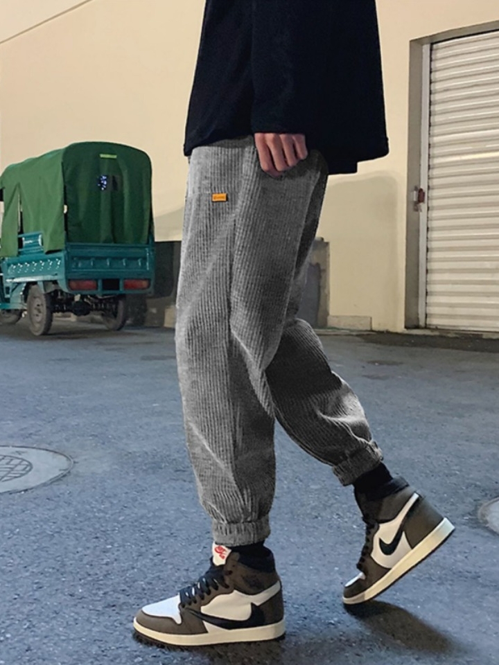 裤子后面大口袋能起到一种修饰的作用,在穿着上也是比较简单的感觉,在裤子上整体都是带有条纹的设计,所以感觉非常时尚,整体是用了灯芯绒的面料,因此能呈现出很洋气的感觉。