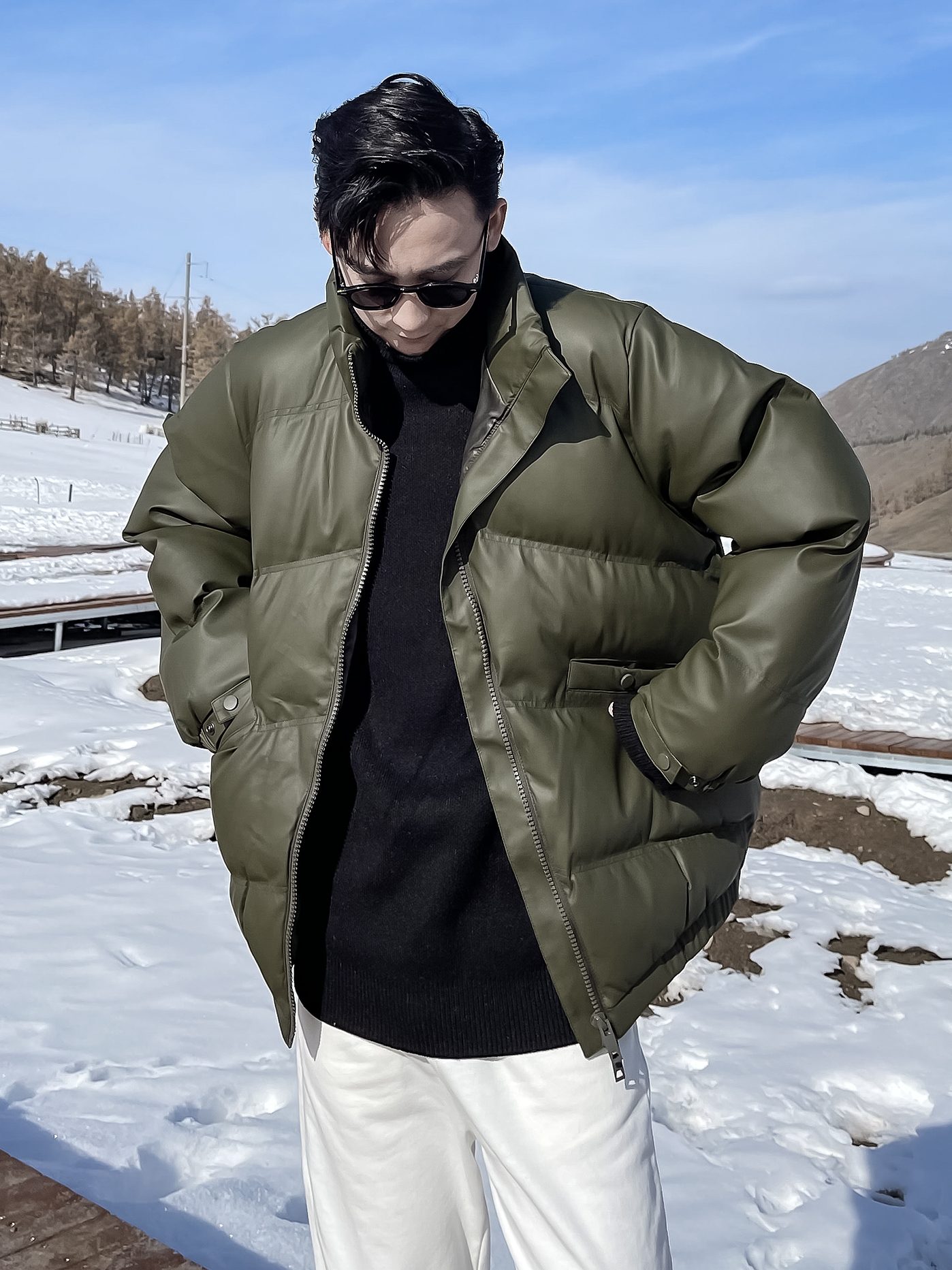 十分厚实的一款面包棉服,内里填充厚实的棉料蓬蓬的搭配上小短款的版型上身保暖,内搭高领衫下半身配上休闲裤十分的洒脱有范儿。