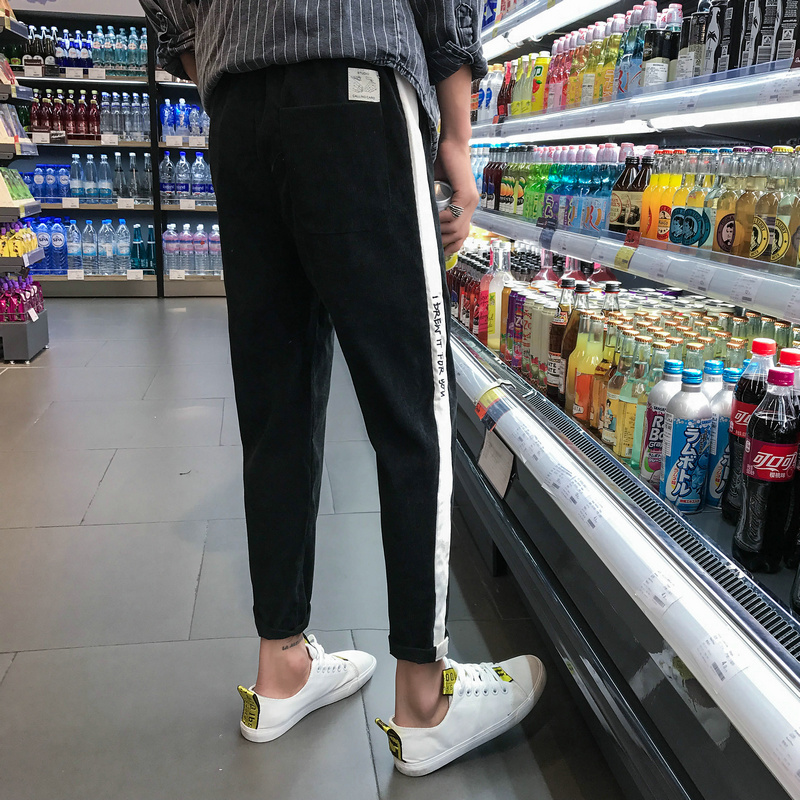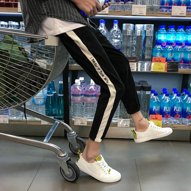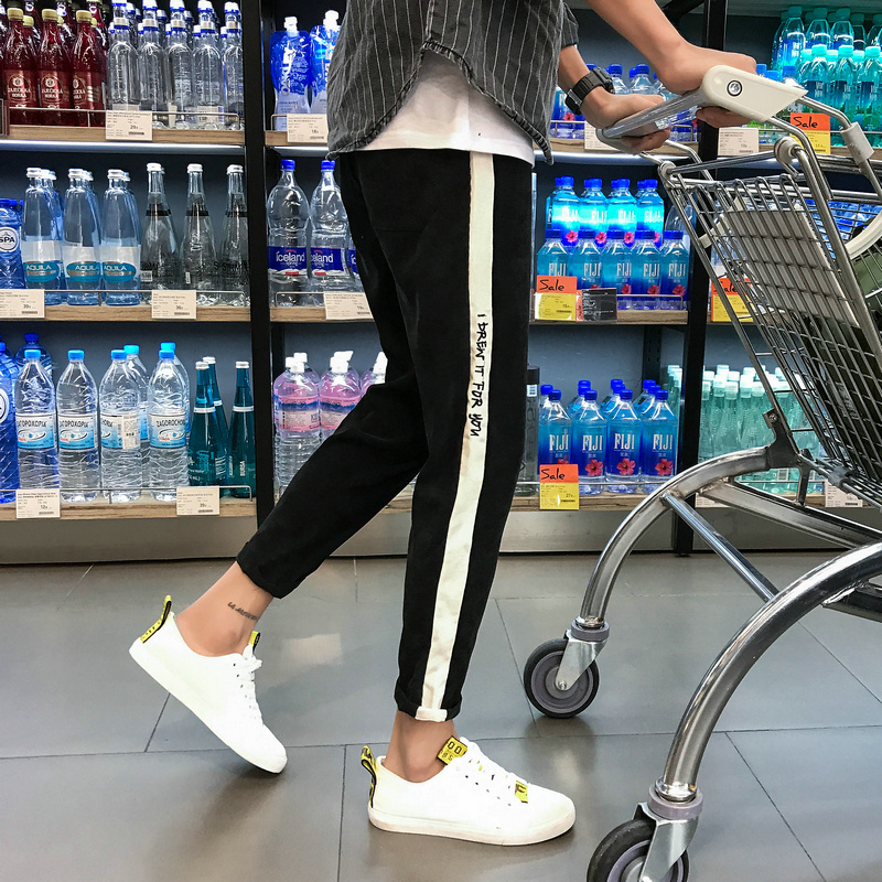 九分裤长,露出纤细脚踝,宽松裤型,穿着舒适自在,搭配运动裤,休闲感十足。