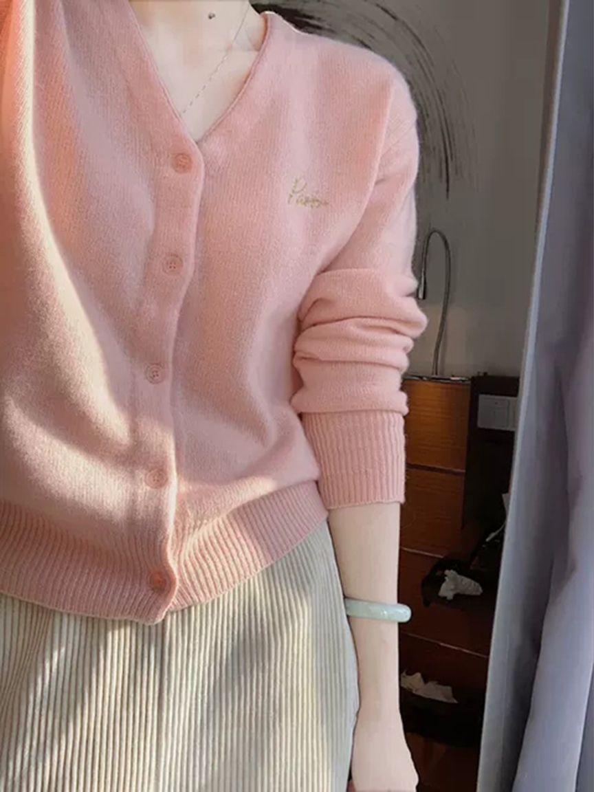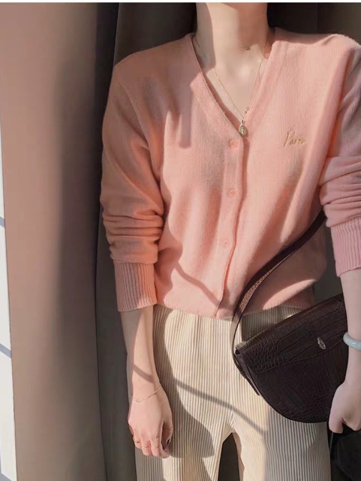 嫩粉色中长款针织开衫,V领式设计的开衫,采用优质保暖常规毛线材质制作而成,上身垂顺自然舒适透气,带着慵懒味道。